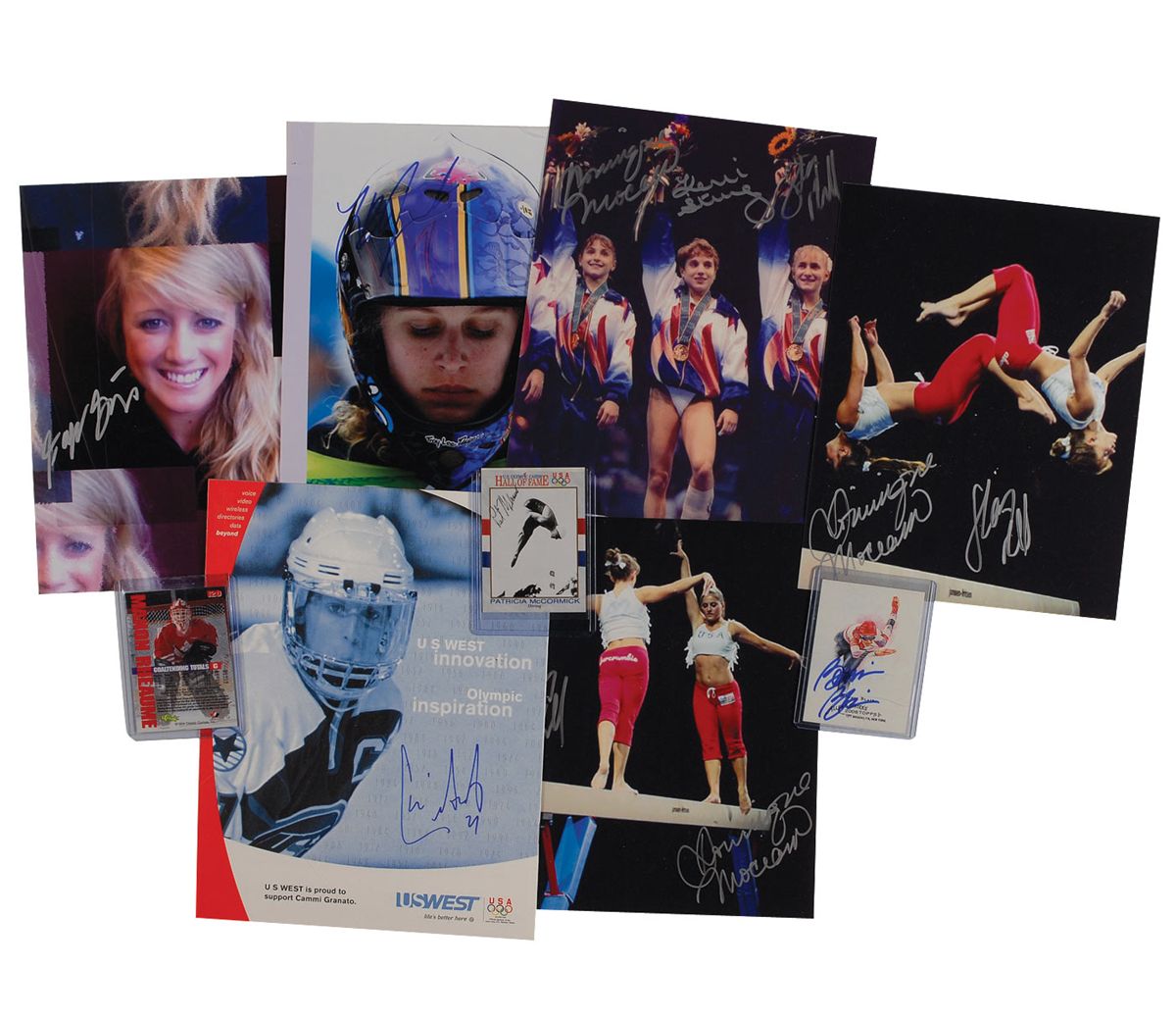 Nine items: five color glossy photos, 8 x 10, each featuring Olympic athletes, and each signed in ink or felt tip by the respective athlete(s) pictured. Signers are: Shannon Miller (3), Dominique Moceanu (3), Kerri Strug, Lindsey Jacobellis, and Faye Gulini; three trading cards, each measuring approximately 2.5 x 3.5, each signed in ink, and each featuring an Olympic athlete (Bonnie Blair, Manon Rheaume, and Patricia McCormick); and a program for Cammi Granato’s Golden Dreams for Children Foundation, August 29, 1999, 8.5 x 11, commemorating the First Annual Charity Hockey Game, signed on the back in blue felt tip. In fine condition.