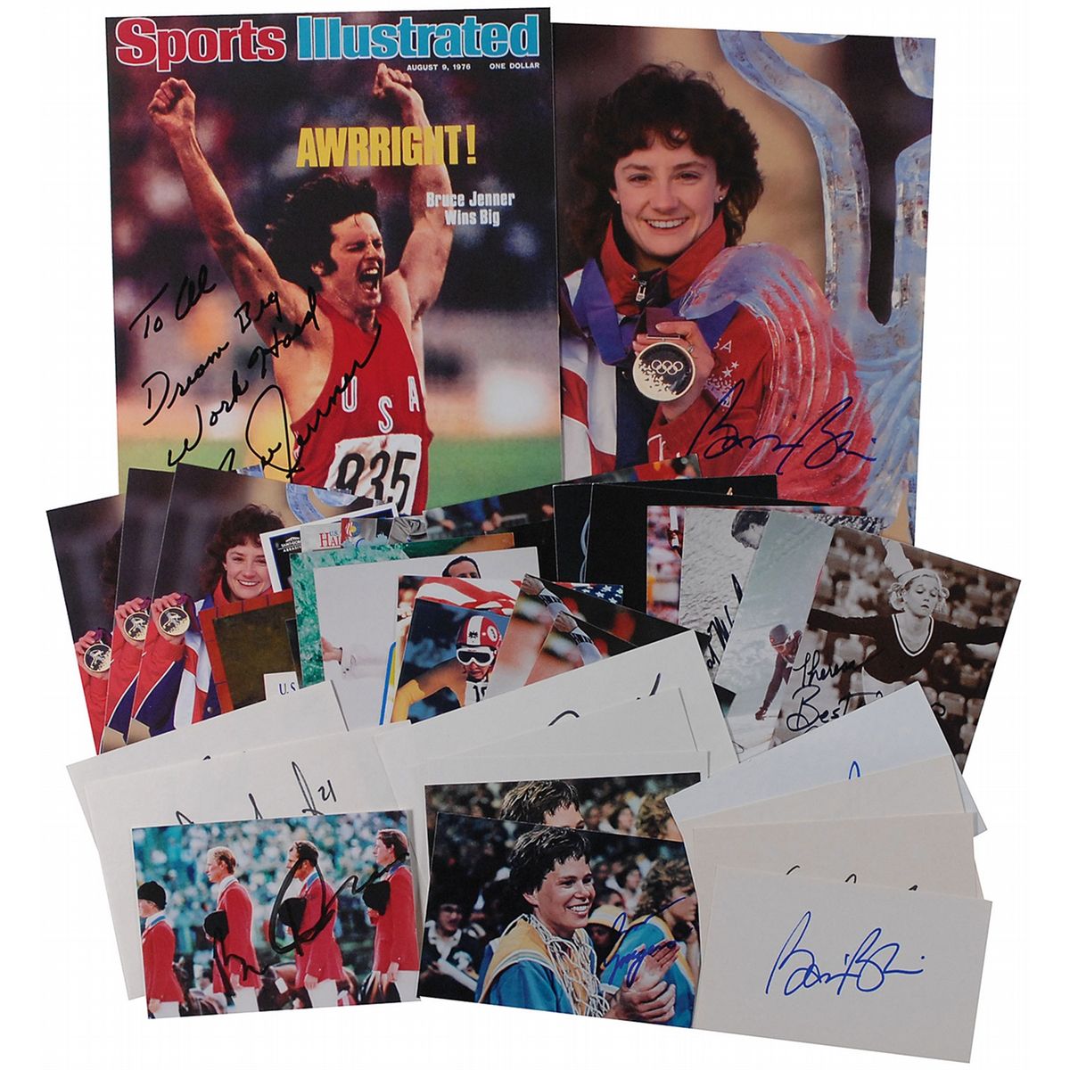 Forty color photos and cards, ranging in size from 2.5 x 3.5 to 8 x 10, each signed in ink or felt tip by the Olympic great pictured. Signers are: Joan Benoit Samuelson, Bonnie Blair (10), Brian Boitano, Leroy Burrell (2), Tracy Caulkins, Nadia Comaneci, Bruce Davidson, Mike Eruzione, Linda Fratianne, Michael Gostigian, Cammi Granato, Bruce Jenner (2), Jean-Claude Killy, Franz Klammer, Karen Lende, Carl Lewis (2), Greg Louganis (2), Brian Martin, Pat McCormick, Ann Meyers (2), Shannon Miller (2), John Naber (2), Cathy Rigby, and Brenda Villa. In overall fine condition.