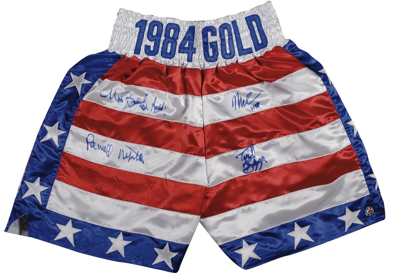 Commemorative red-white-and-blue silk boxing trunks signed in blue felt tip by four 1984 Olympics gold medal recipients. Signers are: Tyrell Biggs, Mark Breland (adding “84 Gold”), Meldrick Taylor, and Pernell Whitaker. In very fine condition.