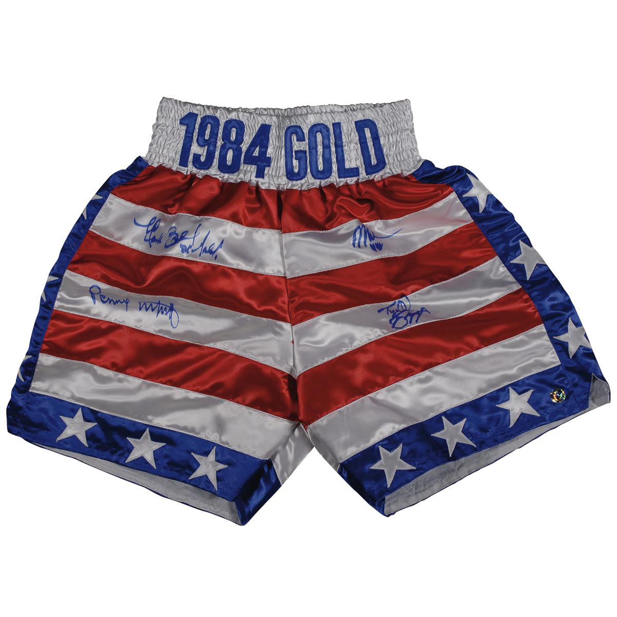 Commemorative red-white-and-blue boxing trunks signed in blue felt tip by four 1984 Olympics gold medal recipients. Signers are: Tyrell Biggs, Mark Breland, Meldrick Taylor, and Pernell Whitaker. In very fine condition.