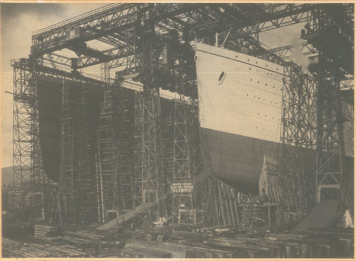Original matte-finish 4.25 x 3 photo of the Olympic under construction at Harland and Wolff’s shipyard. In fine condition, with some mild soiling and a light spot to the lower border. Removed from an original scrapbook containing other period Titanic photographs.