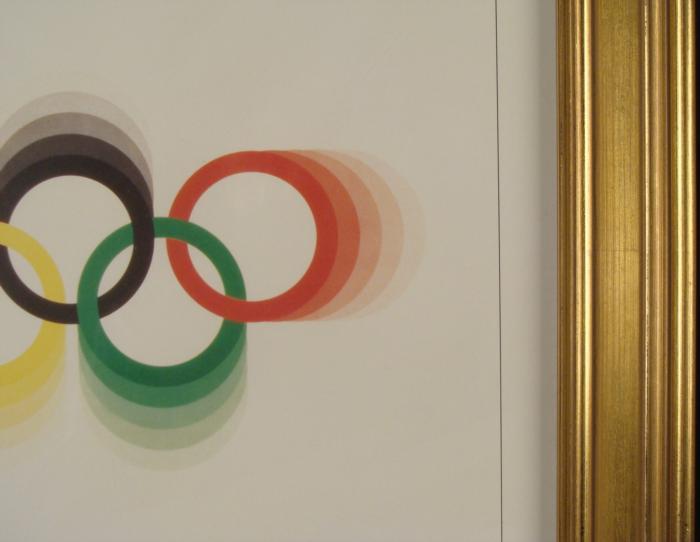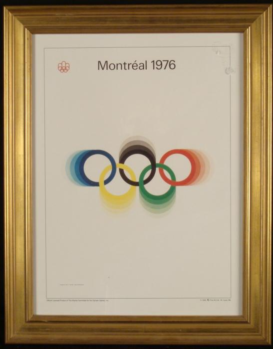 This is a reproduction poster print from the 1976 Olympic Games in Montreal, Canada. Medium: Print on poster paperArtists: Ernst Roch, Rolf HarderImage size: 11 1/2 x 15 1/2 inches Framing: In gold painted wood frameFrame size: 14 3/4 x 18 3/4 inches Condition: Excellent; glass has some sticker residue that will clean off This poster is done by the top design collaborative in Canada, and it is a great piece of modern poster art.