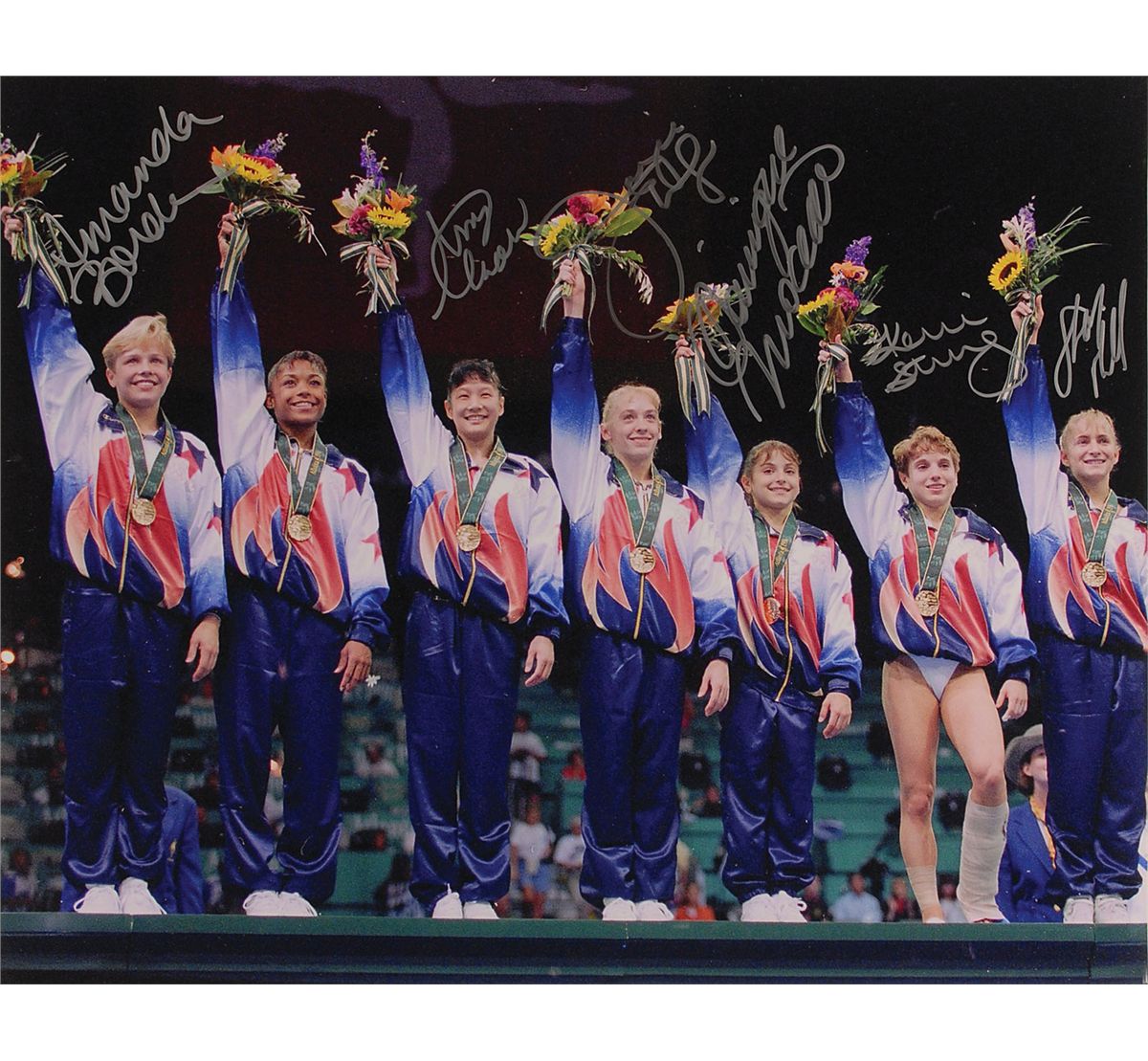Stunning color satin-finish 20 x 16 photo of the ‘Magnificent Seven’ 1996 US Gold Medal-winning Olympic Gymnastics team, signed by six of the Gold Medal winners in silver ink: Amanda Borden, Shannon Miller, Dominique Moceanu, Amy Chow, Kerri Strug, and Jaycie Phelps. In fine condition.