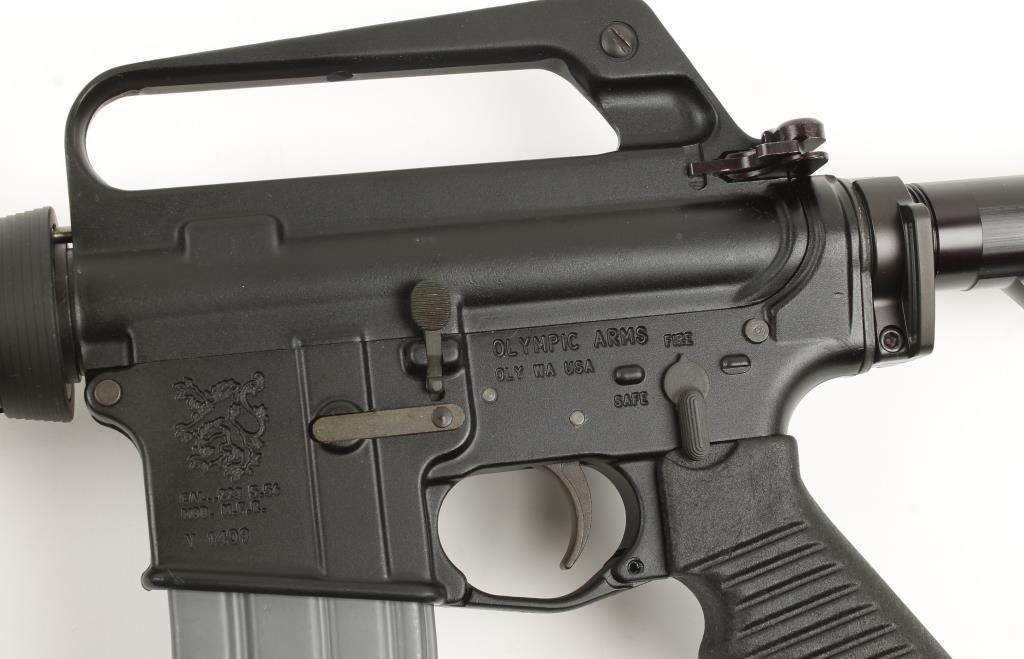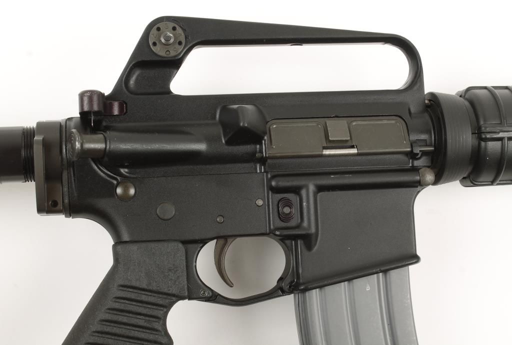 Semi auto AR style semi auto rifle with 16" barrel. Black finish, collapsible black plastic butt stock, grooved pistol grip and hand guard, A2 front sight, carry handle with rear aperture sight and sling swivels. Excellent bore and action. Includes 1 magazine(30 round). Condition: Very good showing light handling.