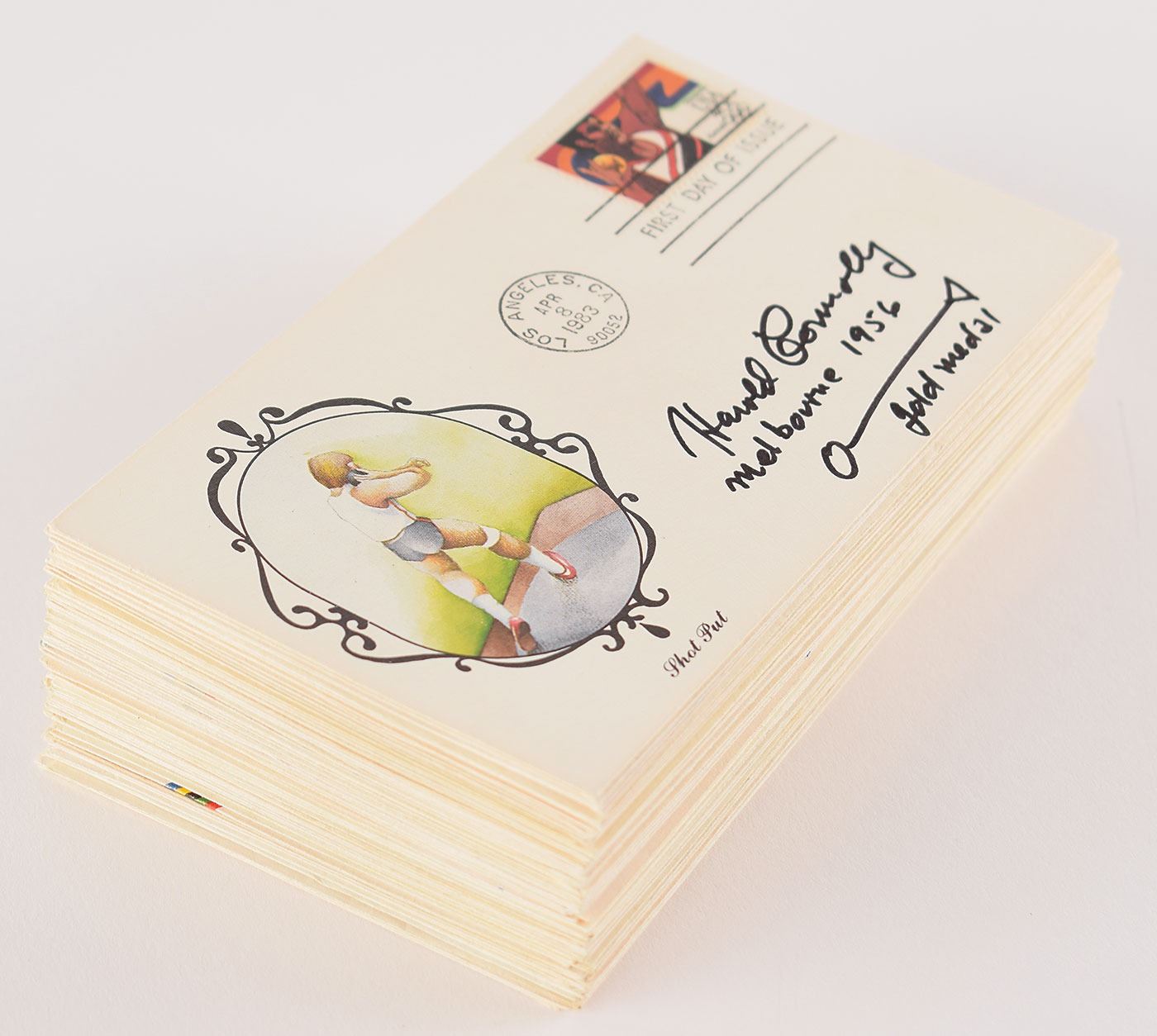 Collection of 76 FDCs with cachets honoring various Olympic Games and events, signed in ink by a multitude of Olympic champions, including: Paul Anderson, Shirley Babashoff, Lanny Bassham, Melissa Belote, Bonnie Blair, Phil Boggs, Ralph Boston, Don Bragg, Mike Bruner, Dick Button, C. S. Campbell, Milt Campbell, Hal Connolly, Willie Davenport, Charles Dumas, Cathy Ferguson, George Foreman, Gretchen Fraser, Linda Fratianne, Ron Freeman, Dan Gable, Pete George, Brian Goodell, Eric Heiden (2), Carol Heiss, Ken Henry, Dianne Holum, Sim Iness, Bruce Jenner, Micki King, Mike Larrabee, Lance Larson, Sammy Lee, Bob Mathias, Pat McCormick, Debbie Meyer, Billy Mills, Jim Montgomery, John Naber, Parry O'Brien, Al Oerter, Mel Pender, Ben Peterson, Pete Rademacher, Cathy Rigby, Arnie Robinson, Mack Robinson, Bill Rodgers, Bob Seagren (3), Frank Shorter, Helen Stephens (2), Jill Sterkel (2), Dwight Stones, Kurt Thomas, Wyomia Tyus, Donna de Varona, Karl Warner, Marshall Wayne, Wayne Wells, Mal Whitfield, and Dave Wottle. Multi-signed covers include: Bill Rodgers, Ralph Boston, Dan Gable, Milt Campbell, and Pete George; Micki King, Marshall Wayne, Phil Boggs, and Sammy Lee; Ralph Boston, Bob Seagren, Jim Montgomery, and Dan Gable; Floyd Patterson, Jerry West, Dan Gable, and Bob Seagren; Jill Sterkel, Shirley Babashoff, Micki King, and Debbie Meyer; and Derek Clayton and Marty Liquori (2). In overall fine condition.