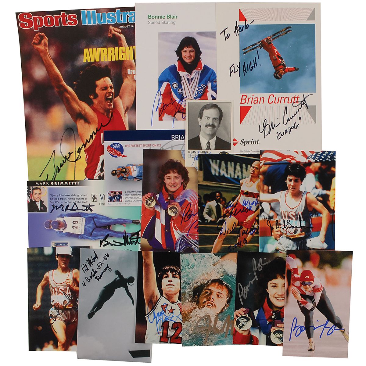Fifteen signed photos, various finishes, most color, ranging in size from 2.5 x 3.5 to 8 x 10, some inscribed, each signed in felt tip or ink by the medalist pictured. Signers are: Bruce Jenner, Bonnie Blair (4), Dick Buerkle, Joan Benoit Samuelson (2), Brian Currutt, Mark Grimmette, Pat McCormick, Carol Blazejowski, John Naber (2), and Brian Martin. In overall fine condition.