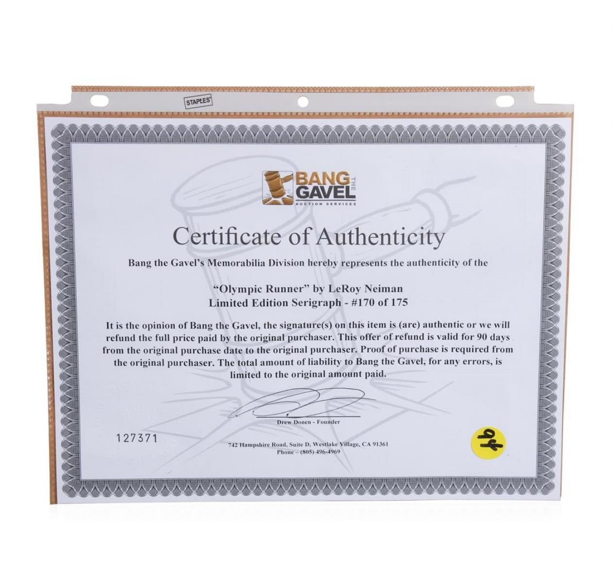 Regarding Memorabilia Items - All autographed memorabilia comes with a Certificate of Authenticity. SAA may have an interest in certain third-party authenticators and bidder hereby waives any potential conflicts therein related to SAA's relationship with such authenticators. SAA is not responsible for the opinions of any of the third-party authenticators. You should in no way rely exclusively on such third-party opinions without conducting your own due diligence prior to bidding. All Certificates of Authenticity may only be relied upon for one year from the date of sale of any item. SAA, and its consignors may be determined to be "Dealer(s)" within the meaning of California Civil Code Section 1739.7(a)(4) and as such make the following statement: SALE OF AUTOGRAPHED SPORTS MEMORABILIA: AS REQUIRED BY LAW, A DEALER WHO SELLS TO A CONSUMER ANY SPORTS MEMORABILIA DESCRIBED AS BEING AUOTOGRAPHED MUST PROVIDE A WRITTEN CERTIFICATE OF AUTHENTICITY AT THE TIME OF SALE. THIS DEALER MAY BE SURETY BONDED OR OTHERWISE INUSRED TO ENSURE THE AUTHENTICITY OF ANY COLLECTIBLE SOLD BY THIS DEALER.