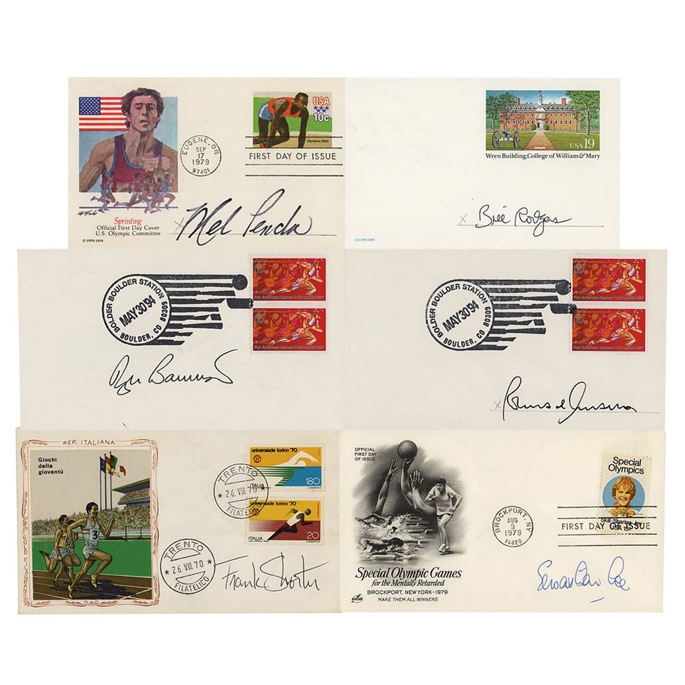 Six commemorative covers signed by Olympic runners, including: Roger Bannister, Frank Shorter, Bill Rodgers, Robert de Castella, Sebastian Coe, and Mel Pender. In overall fine condition.