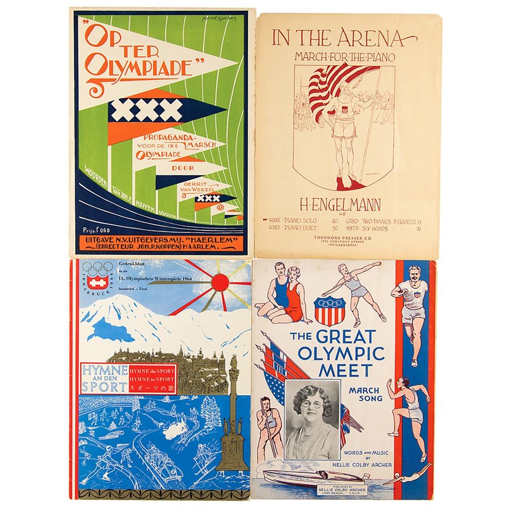 Lot of four sheet music booklets dating between 1903 and 1964 for marches and choir scores related to the following Olympiads—Amsterdam 1928 Summer Olympics (‘Op Ter Olympiade!’ by Gerrit van Weezel and Joh. P. Koppen), Los Angeles 1932 Summer Olympics (‘The Great Olympic Meet’ by Nellie Colby Archer), and Innsbruck 1964 Winter Olympics (‘Hymne to Sport’ by Nic Niobe and Lothar Bar). The fourth is a sheet music booklet for ‘In the Arena’ by Hans Engelmann, published by Theodore Presser Co. in 1903. In overall fine condition, with some edgewear and stains.