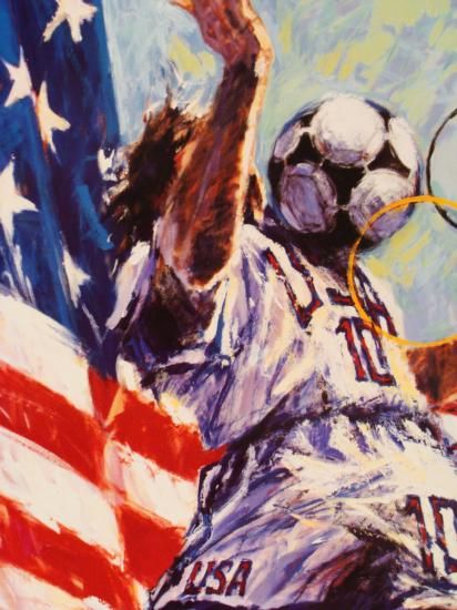 This soccer poster was made in 1996 to celebrate 100 years of U.S. Olympic team glory:Title: "America's Team" Artist: Aldo Luongo Poster on glossy paper 18 × 24 Excellent condition; has been stored rolled; never mounted, matted or framed If you're a soccer fan, this is an exciting poster by a well loved artist. Aldo Luongo (Argentina, b.1941) received his degree from The Academy of Fine Arts in Buenos Aires. Luongo began to paint professionally at the age of 27 while on a trip to Italy, creating 30 originals later displayed in his first solo show in Los Angeles. He's earned both critical praise and attracted the attention of celebrity collectors such as Anthony Quinn, Kevin Costner, Dionne Warwick, Bill Cosby, the late Yul Brynner, Charlton Heston, and Rob Reiner.