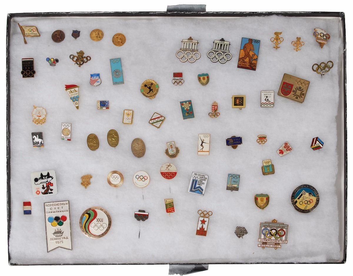 Impressive collection of fifty-nine pins from various Olympic games, the majority of which are Summer Olympiads, ranging in size from .25 x .5 to 1.25 x 2.5, including: 1928 Amsterdam, 1932 Los Angeles, 1936 Garmisch, 1936 Berlin, 1948 London, 1952 Helsinki, 1960 Rome, 1964 Tokyo, 1964 Innsbruck, 1968 Grenoble, 1968 Mexico City, 1972 Munich, 1976 Montreal, 1980 Moscow, 1980 Lake Placid, 1984 Sarajevo, and others. In overall fine condition. An extremely appealing assemblage of hard-to-find pins from a myriad of early Olympic Games.