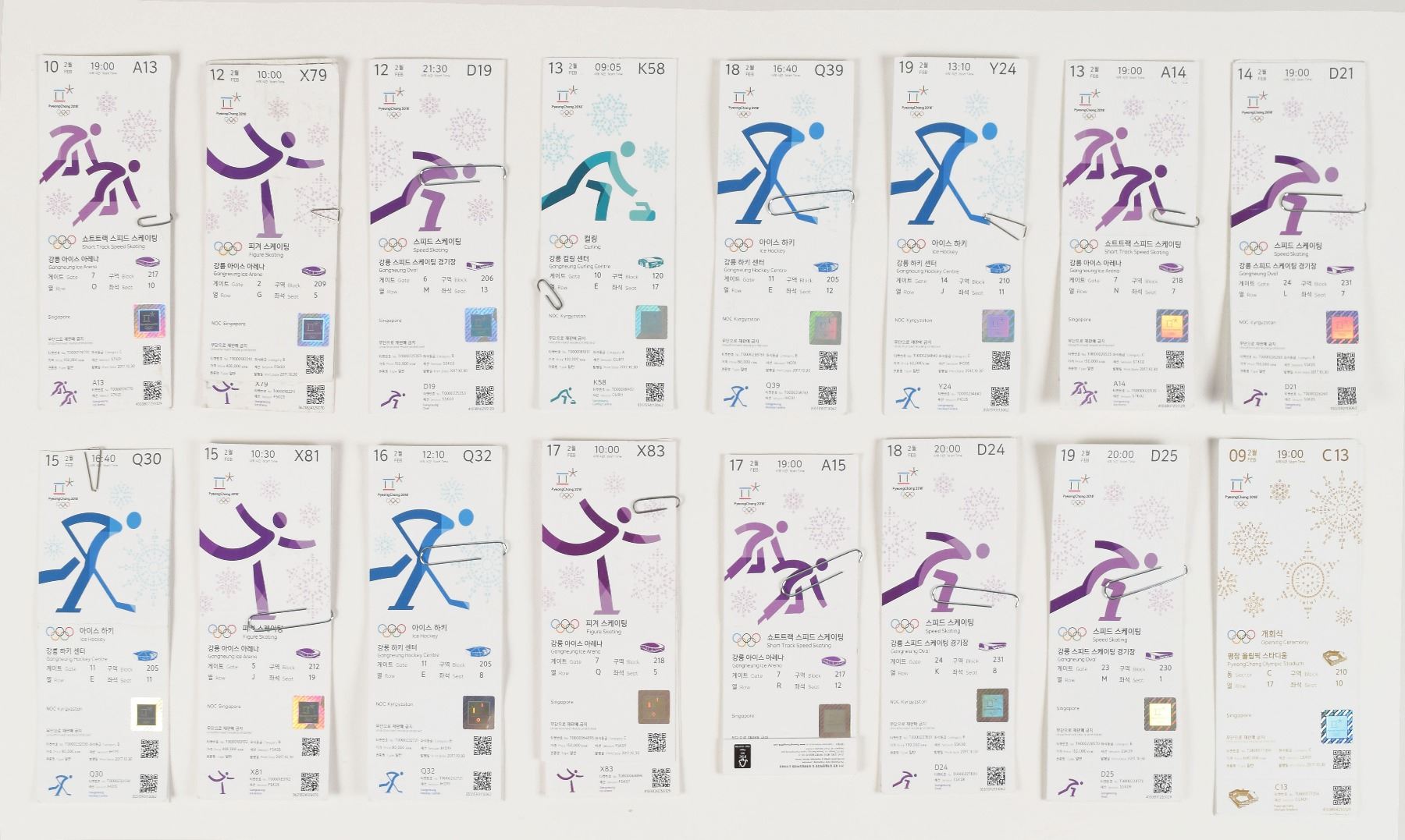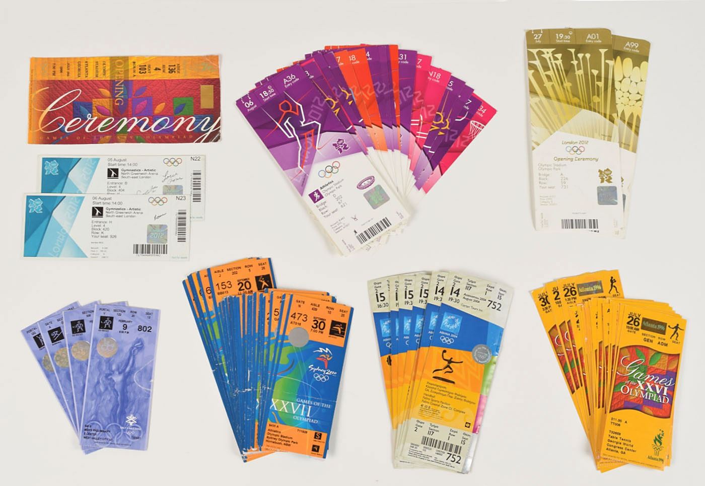 Collection of 129 tickets and ticket stubs for six Olympic Games, with some opening and closing ceremony tickets, including: Atlanta 1996 Summer Olympics (26); Sydney 2000 Summer Olympics (33); Salt Lake City 2002 Winter Olympics (4); Athens 2004 Summer Olympics (8); London 2012 Summer Olympics (24); and PyeongChang 2018 Winter Olympics (34). In overall very good to fine condition, with some bending and folds from use.