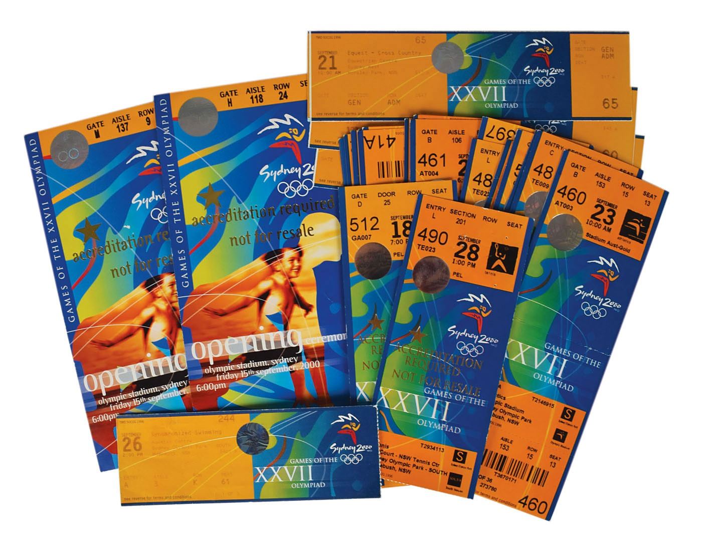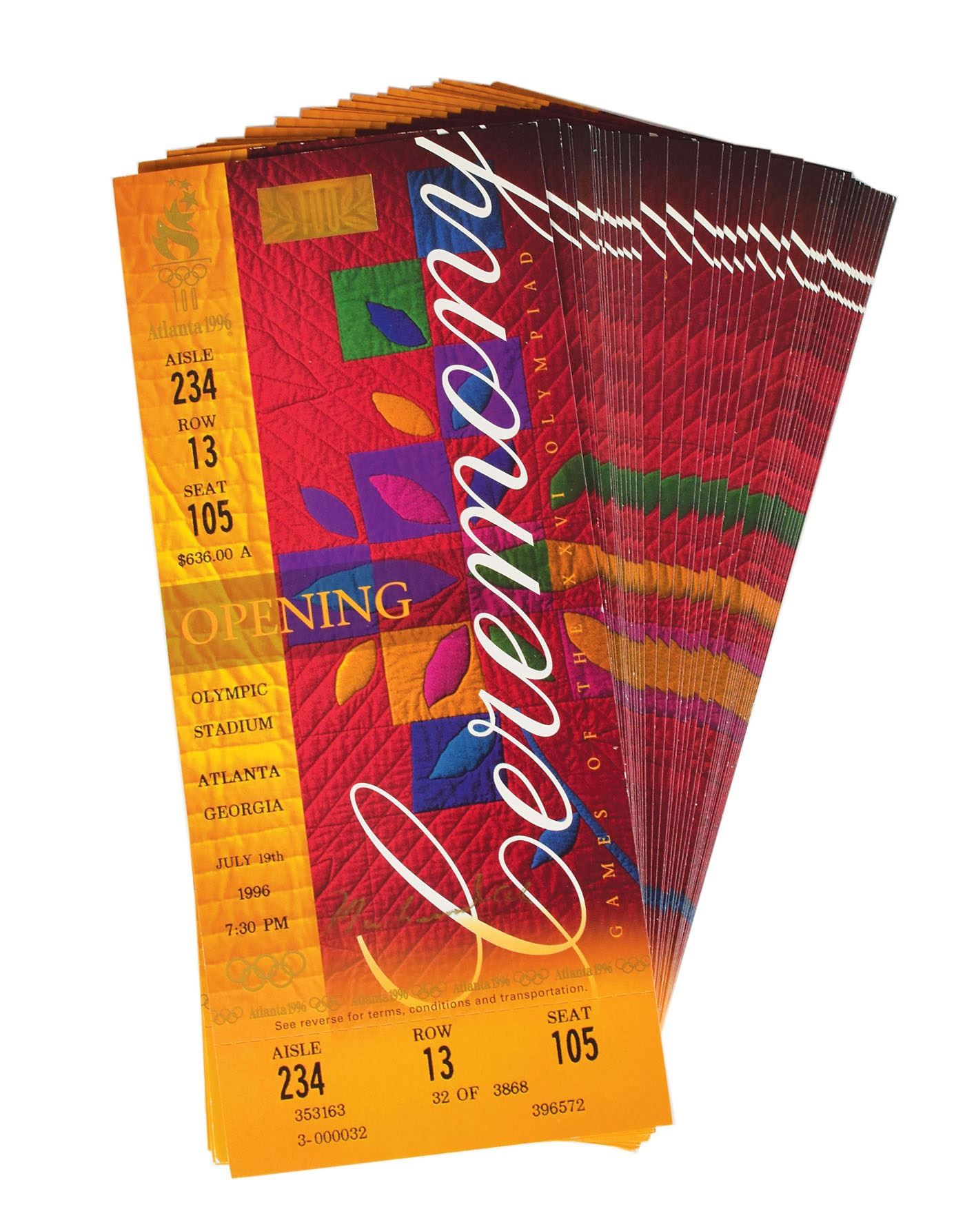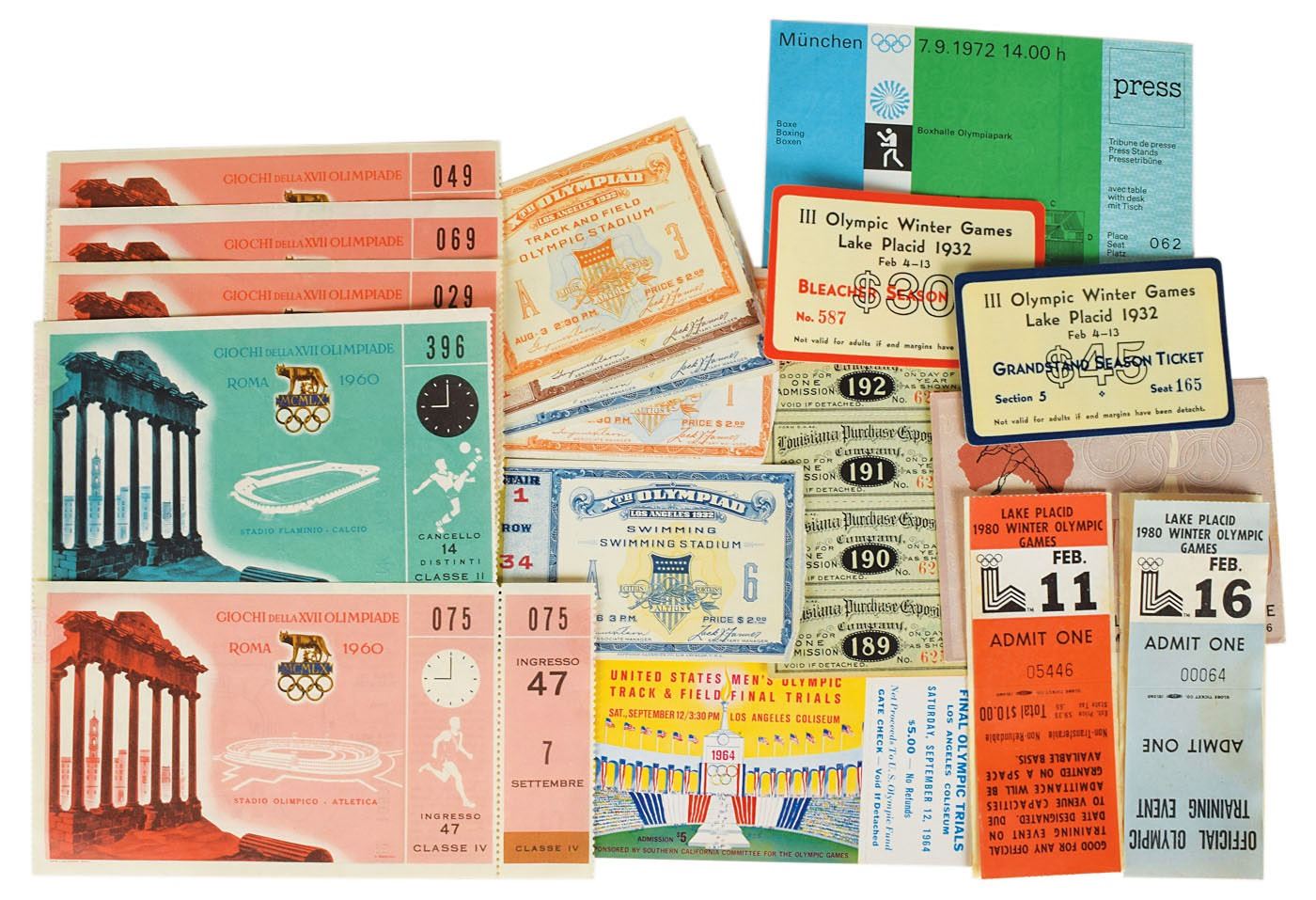 Massive collection of nearly 1100 tickets, ticket stubs, and passes for various Olympic Games and events, ranging from the 1904 Louisiana Purchase Exposition to the 2002 Salt Lake City Winter Games. The Olympics represented in the collection are: 1904 Louisiana Purchase Exposition (4); 1932 Lake Placid (2); 1932 Los Angeles (4); 1936 Berlin; 1952 Helsinki (2); 1956 Melbourne; 1960 Rome (5); 1960 Squaw Valley; 1964 Los Angeles Olympic Trials; 1968 Mexico City Boxing Trials in Maumee, Ohio; 1972 Munich; 1972 Sapporo; 1980 Lake Placid (4, including gold medal hockey game between USA and Finland); 1980 Moscow (13); 1984 Los Angeles (18); 1988 Calgary (20); 1988 Calgary Opening Ceremonies (5); 1992 Barcelona (20); 1994 Lillehammer (over 650 tickets, including 15 booklets); 1996 Atlanta (110); 1996 Atlanta Meal Tickets (88); 1996 Atlanta Opening Ceremonies (41); 1996 Atlanta Closing Ceremonies (55); 2000 Sydney (24); 2000 Sydney Opening Ceremonies (2); and 2002 Salt Lake City (4). In overall very good to fine condition.
