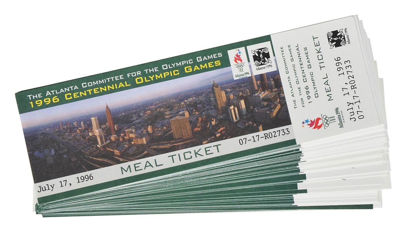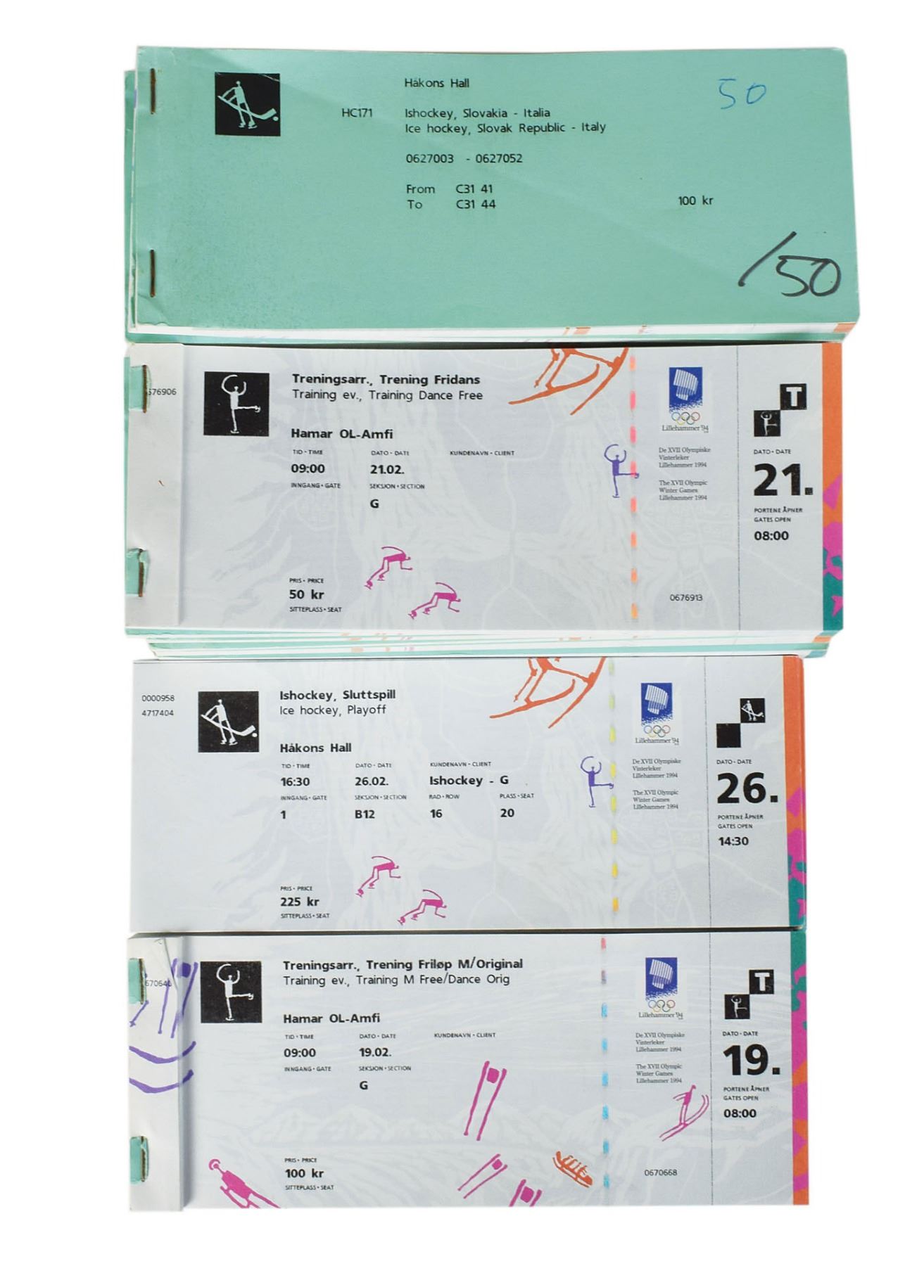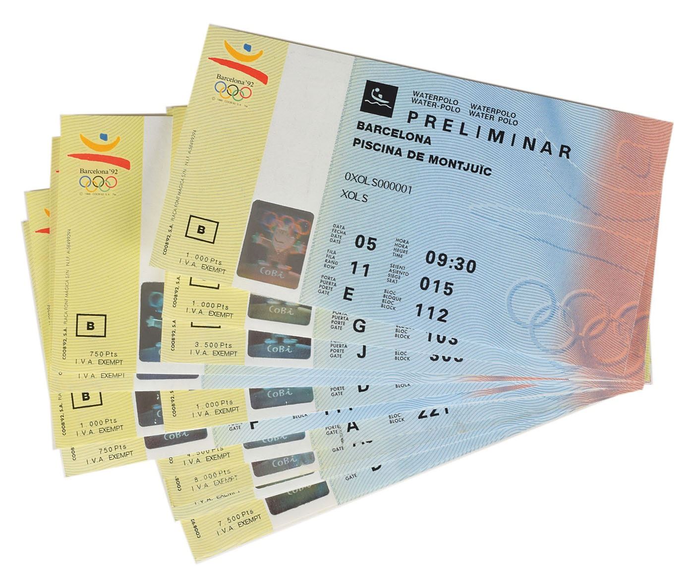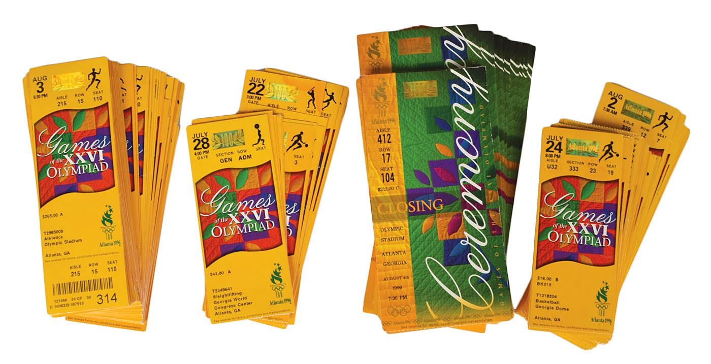 Massive collection of nearly 1100 tickets, ticket stubs, and passes for various Olympic Games and events, ranging from the 1904 Louisiana Purchase Exposition to the 2002 Salt Lake City Winter Games. The Olympics represented in the collection are: 1904 Louisiana Purchase Exposition (4); 1932 Lake Placid (2); 1932 Los Angeles (4); 1936 Berlin; 1952 Helsinki (2); 1956 Melbourne; 1960 Rome (5); 1960 Squaw Valley; 1964 Los Angeles Olympic Trials; 1968 Mexico City Boxing Trials in Maumee, Ohio; 1972 Munich; 1972 Sapporo; 1980 Lake Placid (4, including gold medal hockey game between USA and Finland); 1980 Moscow (13); 1984 Los Angeles (18); 1988 Calgary (20); 1988 Calgary Opening Ceremonies (5); 1992 Barcelona (20); 1994 Lillehammer (over 650 tickets, including 15 booklets); 1996 Atlanta (110); 1996 Atlanta Meal Tickets (88); 1996 Atlanta Opening Ceremonies (41); 1996 Atlanta Closing Ceremonies (55); 2000 Sydney (24); 2000 Sydney Opening Ceremonies (2); and 2002 Salt Lake City (4). In overall very good to fine condition.