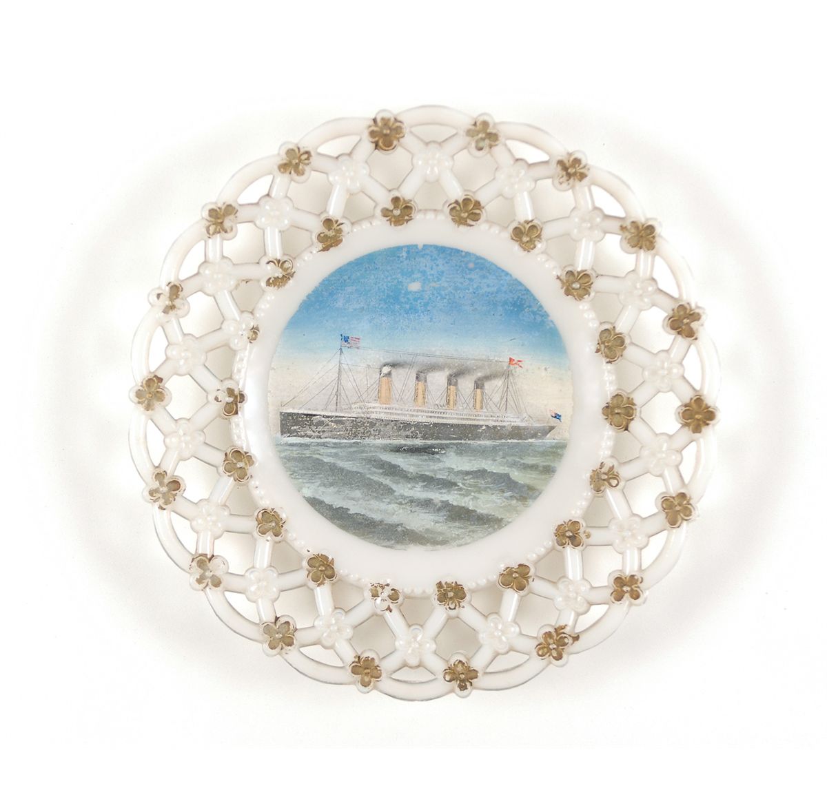 An original period 1911 milk glass ribbon plate featuring a hand-painted image of Olympic/Titanic. Measuring just over seven inches across, souvenir ribbon plates like this example were sold on board the Olympic and Titanic in the barber shop of the vessels.