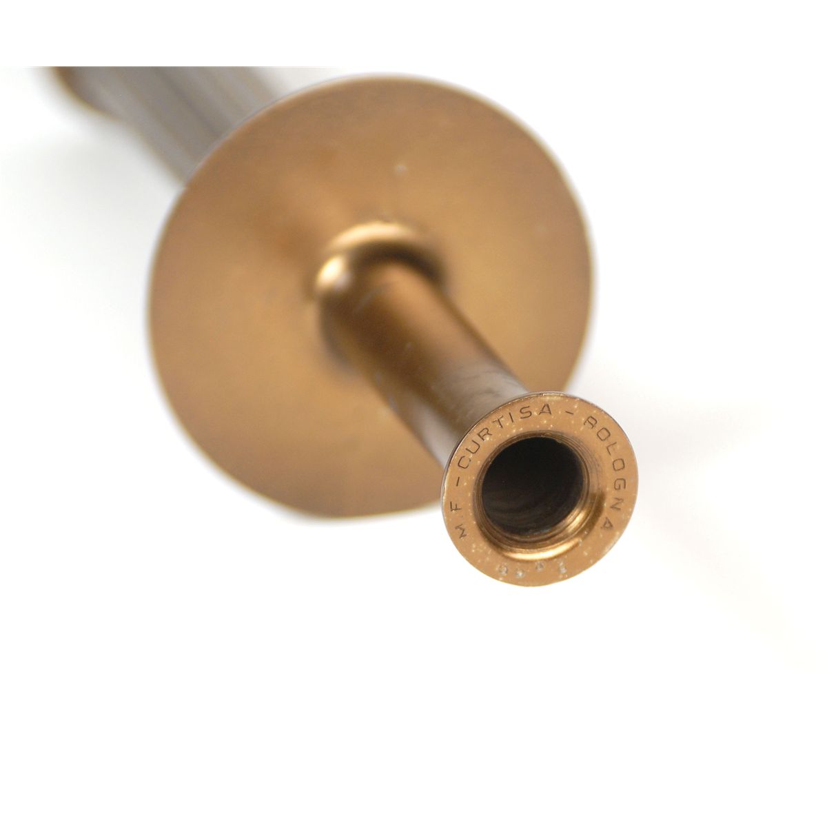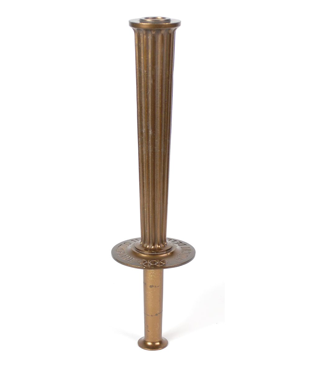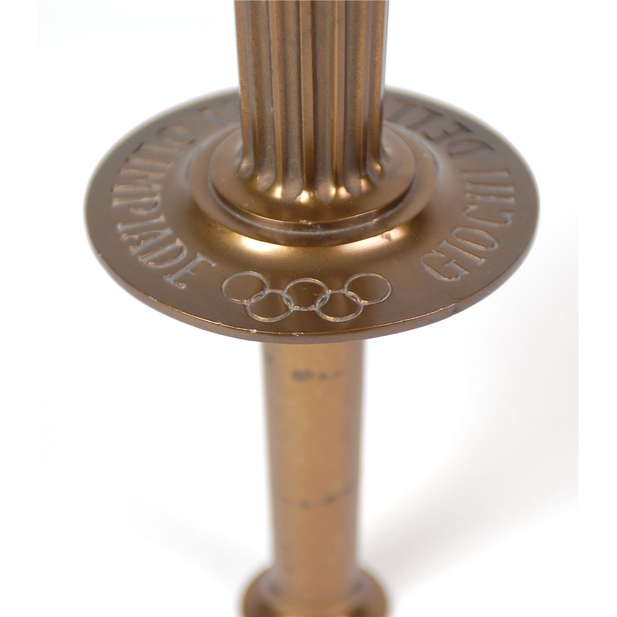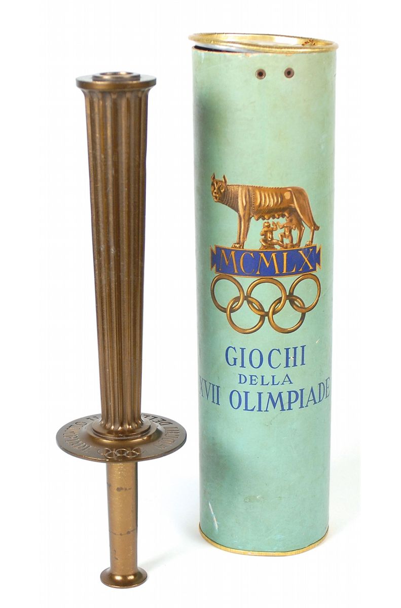 An original torch from the 1960 Summer Olympics in Rome, Italy, measuring 15.75? long, engraved on the bottom, “MF—Curtisa—Bologna” and “2855,” with both “5” numerals upside down. The circular guard above the handle is engraved with the Olympic rings and the words “Giochi Della XVII Olimpiade.” The bronzed aluminum torch is exquisitely designed in a fluted conical form, evocative of classical Roman art and architecture. Includes the original canister. A scarce and wonderful piece from the classic Olympiad that announced the greatness of icons like Cassius Clay, Wilma Rudolph, and Rafer Johnson.