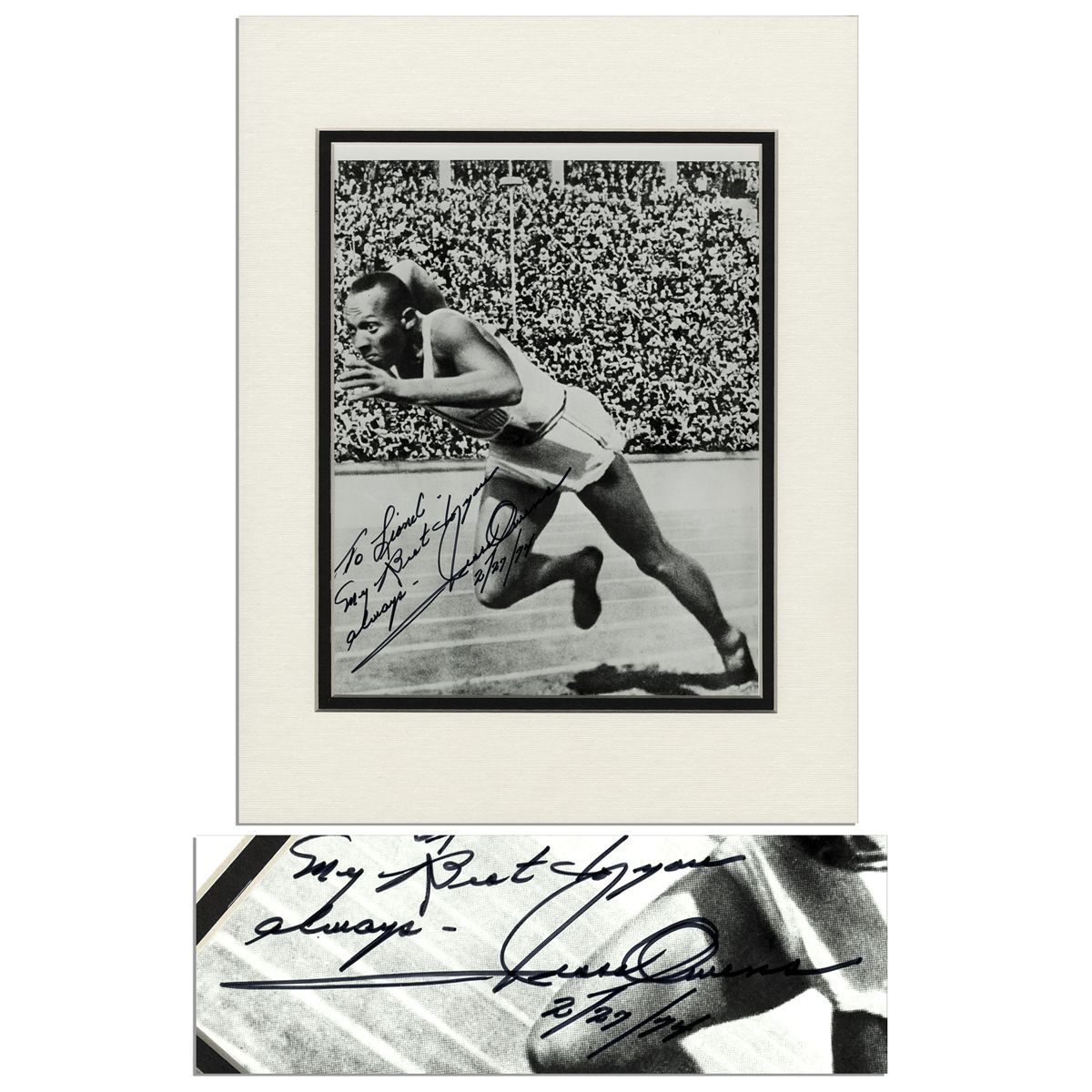 Jesse Owens photo signed of himself running toward one of his 4 gold medals in the memorable 1936 Olympics in Berlin. His autograph inscription in black felt tip reads, ''To Lionel - My Best to you always - / Jesse Owens / 2/27/74''. Owens' phenomenal series of wins at the 1936 games famously dispelled Hitler's philosophy of aryan supremacy on the global stage. Glossy black and white photo measures 8'' x 10''. Near fine.