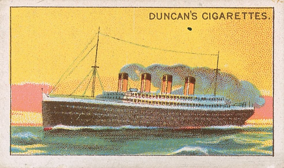 Vivid 1925 Duncan’s Cigarettes ‘Evolution of the Steamship’ series color tobacco card, 2.5 x 1.5, featuring a beautiful artist’s rendition of the Titanic at sea during a sunset. Bears a brief printed description of the Titanic on the reverse. In fine condition.