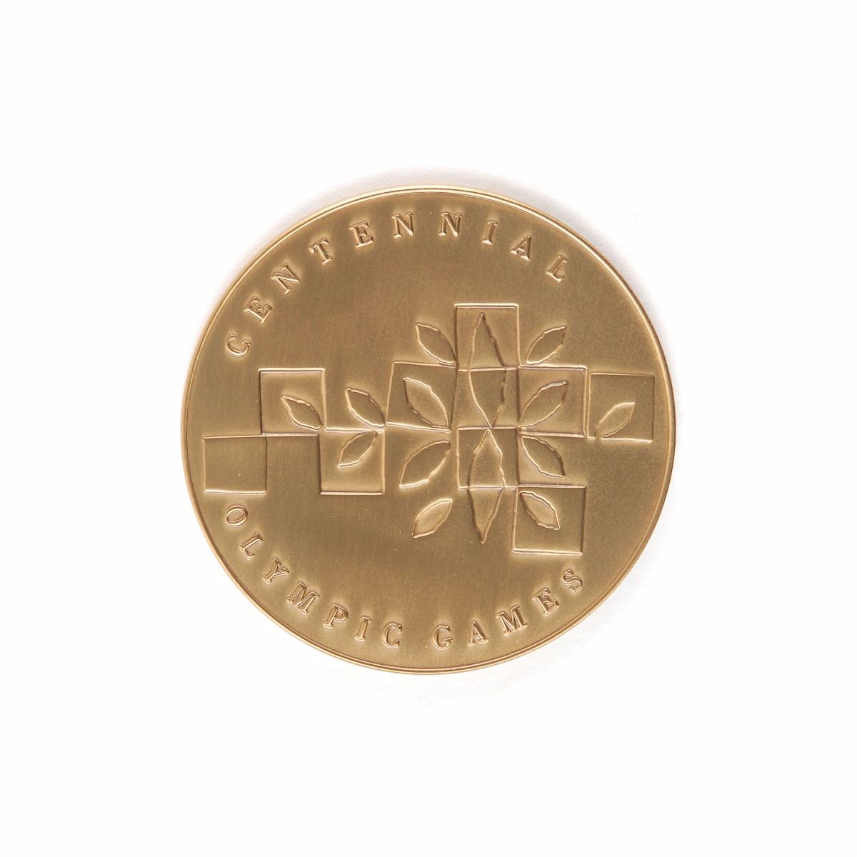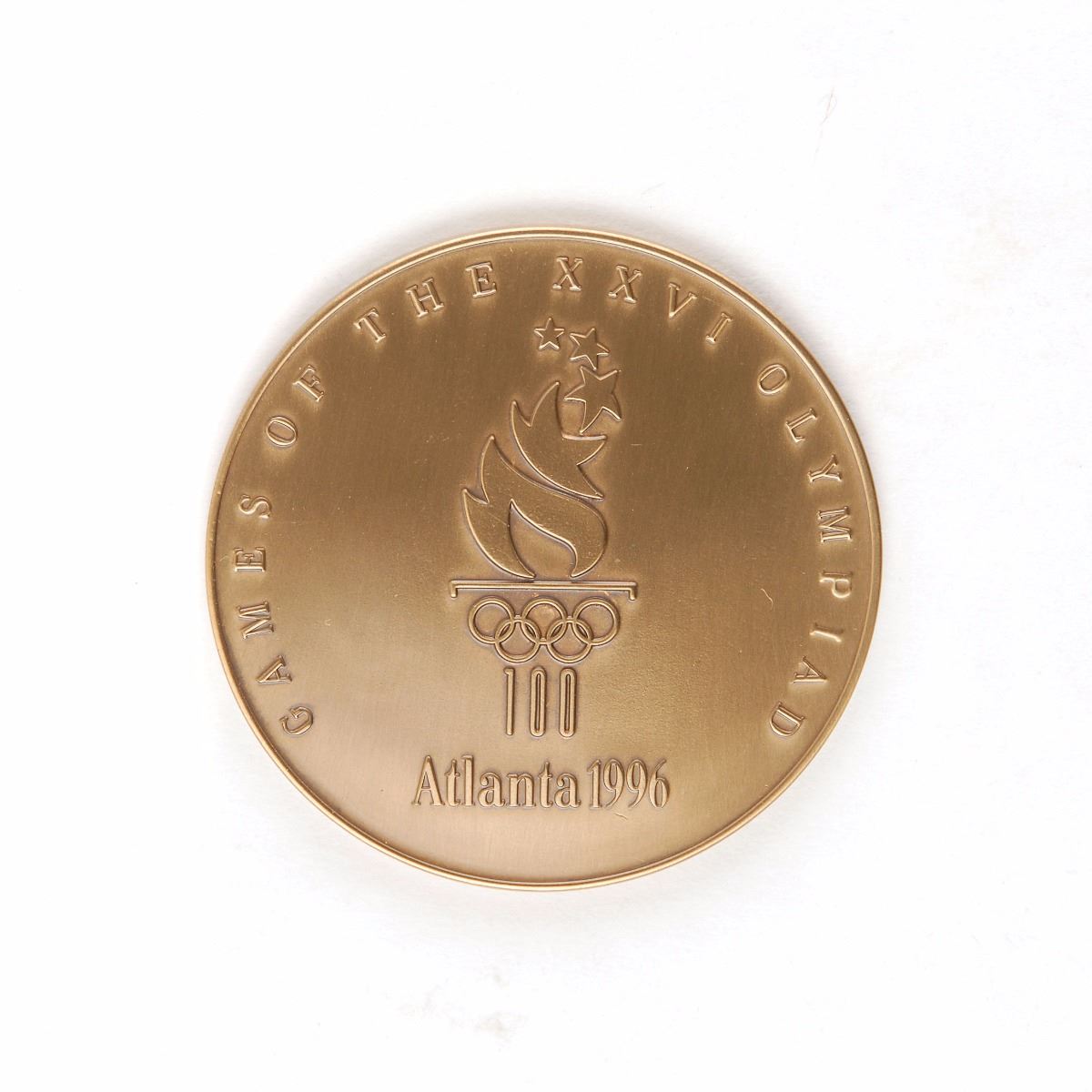 Participation medal issued for the 1996 Atlanta Summer Olympics. Bronze, 60 mm, 60 gm, by Malcolm Grear Designers. The front features the Atlanta Games emblem under raised text, “Games of the XXVI Olympiad”; the reverse bears a quilt of leaves and the raised text, “Centennial Olympic Games.” Complete with its original velvet pouch and green box.