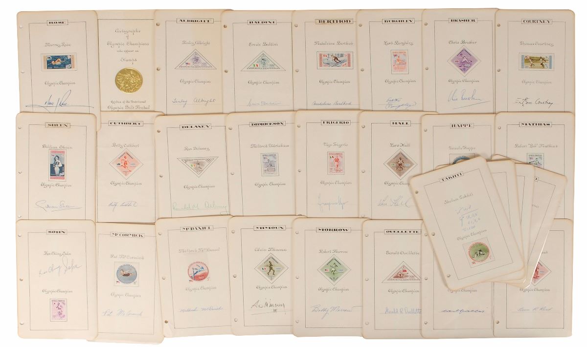 Appealing collection of twenty-five ink signatures from various Olympic champions, each signed on individual hand-embellished 6 x 9.5 sheets with affixed (or partially affixed) postage stamps honoring the respective athlete. Olympians include: Tenley Albright, Ercole Baldini, Madeleine Berthod, David Burghley, Chris Brasher, Thomas Courtney, Betty Cuthbert, Ron Delaney, Ugo Frigerio, Lars Hall, Ursula Happe, Bob Mathias, Pat McCormick, Mildred McDaniel, Alain Mimoun, Robert Morrow, Gerald Ouellette, Carlo Pavesi, Norman Read, Murray Rose, Gillian Sheen, Kee Chung Sohn, Terence Spinks, Gholam Takhti, and Hans Winkler. Includes a sheet signed by Brazilian tennis phenom Maria Ester Bueno, as well as an unsigned sheet for Mildred ‘Babe’ Didrikson. Collection is housed in a vintage three-ring binder. In overall fine condition.