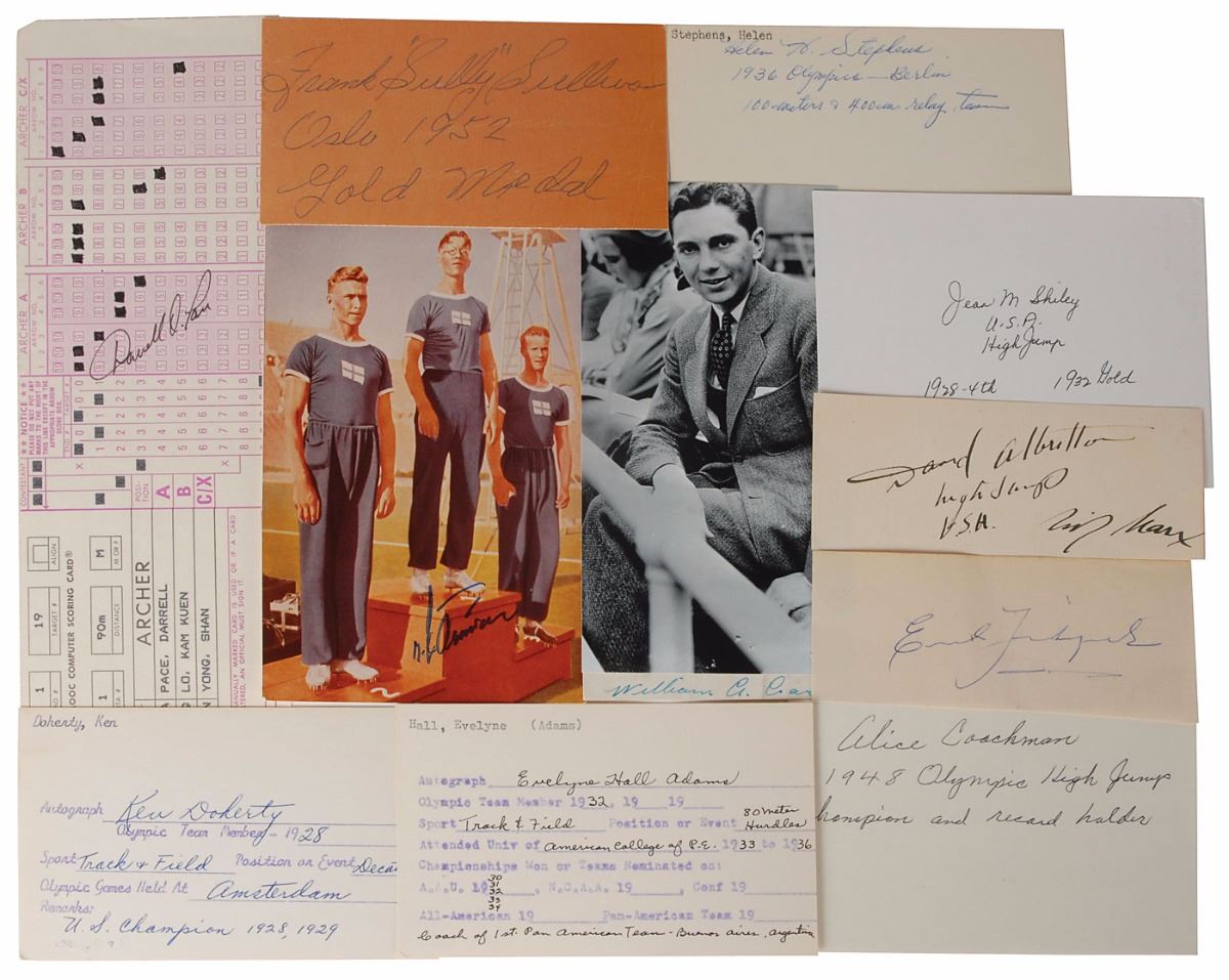 Collection of eleven items, consisting mostly of slips and autograph sheets, each signed by an Olympic athlete, including: David Albritton, Bill Carr, Alice Coachman, Ken Doherty, Evelyne Hall, Matti Järvinen (SP), Darrell Pace (archery card), Jean Shiley, Helen Stephens, Frank Sullivan, and Emil Zátopek. In overall fine condition.
