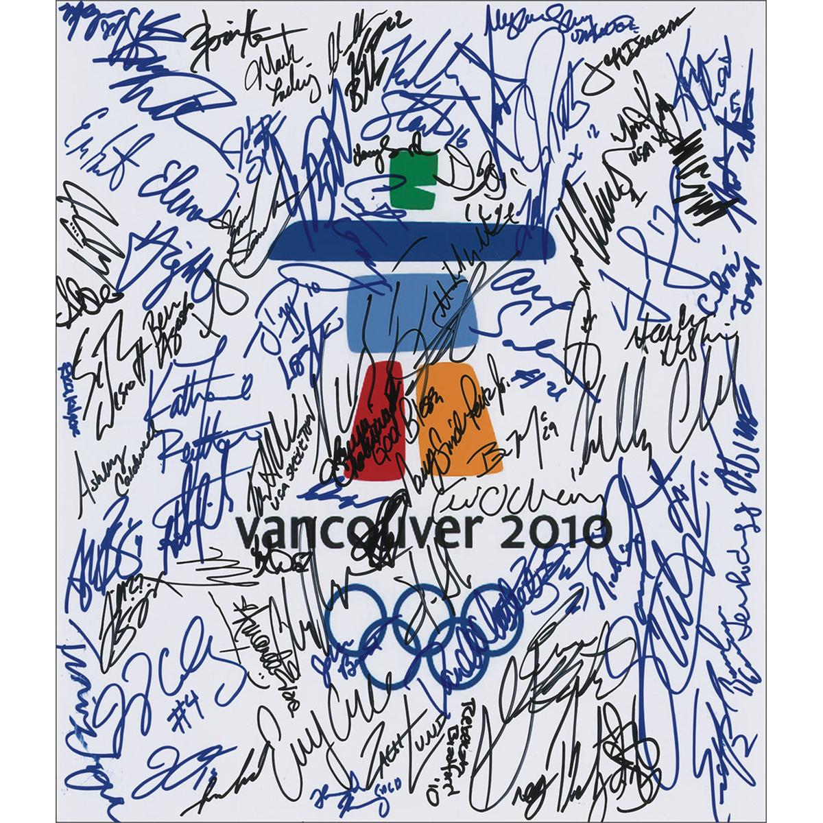 Color glossy 12 x 12 photo of the 2010 Winter Olympics logo, signed in blue and black felt tip by 61 members of the 2010 US Olympic team, as well as eight members of the Paralympic team. The signers include (by category): Alpine Skiing: Megan McJames, Coach Josh Applegate; Bobsled: Steven Holcomb, Curtis Tomasevicz, Nick Cunningham, John Napier, and Jamie Moriarty; Cross Country: Torin Koos, Andrew Newell, James Southam, Elizabeth Stephen; Curling: John Benton, Jeff Isaacson, and Chris Plys; Figure Skating: Meryl Davis, Mirai Nagasu, Tanith Belbin and Ben Agosto, Evan Bates and Emily Samuelson, Amanda Evora and Mark Ladwig, and Jeremy Barrett; Freestyle Skiing: Hannah Kearney, Emily Cook, Lacy Schnoor, and Ashley Caldwell; Women’s Ice Hockey: Kacey Bellamy, Julie Chu, Erika Lawler, Brianne McLaughlin, Angela Ruggiero, Molly Schaus, Kelli Stack, Karen Thatcher, Hilary Knight, Lisa Chesson, and Jinelle Zaugg; Luge: Dan Joye; Nordic Combined: Johnny Spillane. Short Track Speed Skating: Katherine Reutter, Travis Jayner, and Jordan Malone; Skeleton: Zach Lund and Katie Uhlaender; Snowboard: Seth Wescott, Louie Vito, Gregory Bretz, Lindsey Jacobellis, Kelly Clark, Elena Hight, and Faye Gulini; Speed Skating: Brian Hewson, Mithcell Whitmore, Lauren Cholewinski, Maria Lamb, Elli Ochowicz, Nancy Swider- Peltz Jr., Jen Rodriguez, Heather Richardson, and Rebekah Bradford. Paralympic atheletes: Brad Emmerson, Taylor Lipsett, Alexi Salamone, Jimmy Connelly, Bradley Washburn, Kelly Underkofler, and Ricci Kilgore. In very fine condition.