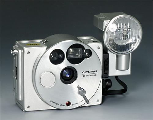 Olympus O-Product, 1988 "A new concept in product design. Functional imperatives molded to artistic form. A camera shaped with simple lines, elegant contours." Limited edition, no. 13754/20.000. Aluminum body. With "Olympus Lens 3,5/35".<Br>