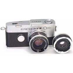 Olympus, Japan: 1) "Pen FT", 18 x 24 mm, Chrom, F. Zuiko Auto-S 1,8/38, schöner Zustand, 1 Bajonett-schraube fehlt, Tasche und Objektivdeckel. - 1 bayonet screw missing, with case and lens cap. - Und: 2) Konverter "Auto Teleplus 2x" (3/2). - € 200/325 - (63/54)