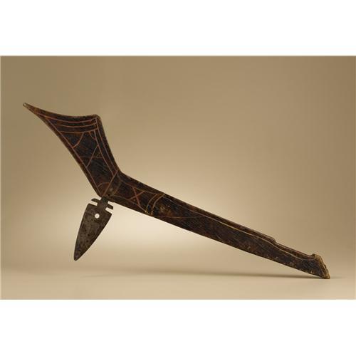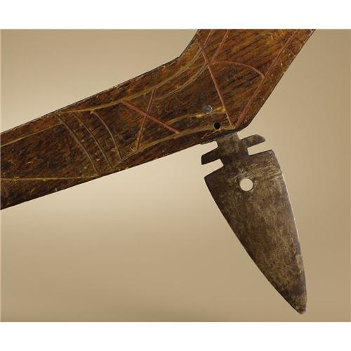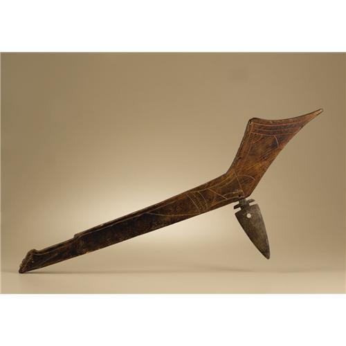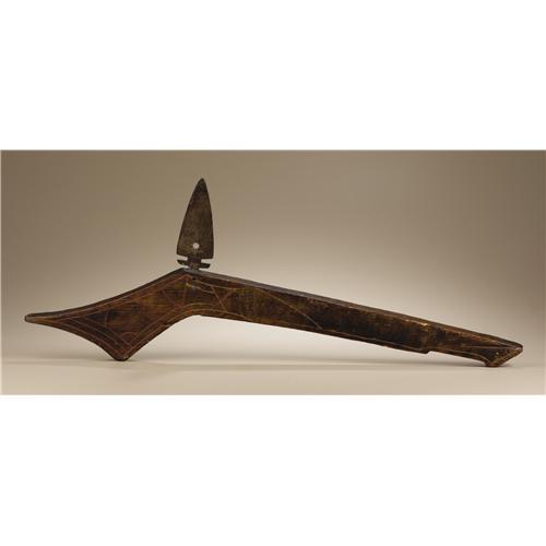 <B>Omaha Gunstock Club</B></I><BR>Circa 1850<BR>Length 28 in.<BR><BR>This classic gunstock club is made of pinewood and engraved on each side with single line designs, most painted with vermilion. The club is fitted with a double edged steel blade that is anchored to the stock with a metal pin and a lead collar. The handle is decorated with two brass tacks and there is hot file branding on the hand grip. The club has a fine, deep brown patina.<BR><BR>Provenance<BR>Ex-Museum of the American Indian, Heye Foundation with collection number painted on the stock in black 19/5093. The club was de-accessioned by exchange in November, 1963.<BR><BR> <BR><BR><B>Importan