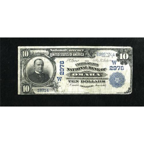 <B>Omaha, NE</B></I> - $10 1902 Date Back Fr. 616 <B>The United States NB</B></I> Ch. # (W)2978<BR> This piece received a bath, but is a popular issue boasting a forbidden title. <B>Very Good.</B></I><BR><BR><b>Shipping:</b> Coins & Currency (<a target="_blank" href="http://www.heritageauctions.com/common/shipping.php">view shipping information</a>)