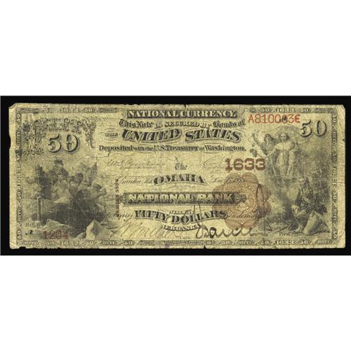 <B>Omaha, NE</B></I> - $50 1882 Brown Back Fr. 510 <B>The Omaha NB</B></I> Ch. # 1633<BR>This is a new addition to a very limited census, as the newest Kelly data shows just seven $50 Brown Backs extant from all Nebraska banks combined. There are a few minor flaws consistent with the grade here, but the note is solid, albeit well circulated. Pen signed <B>Very Good.</B></I>