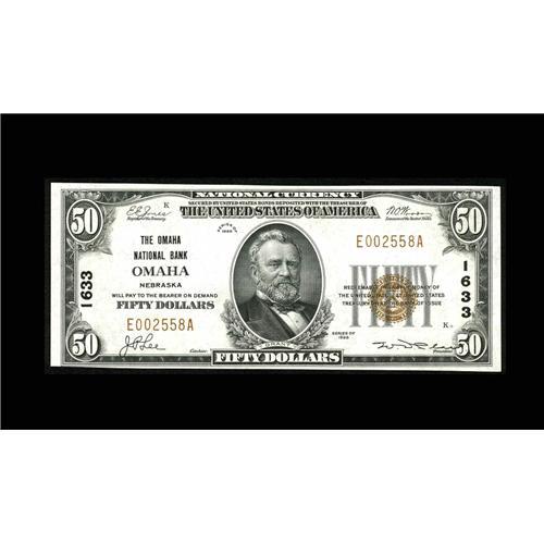 <B>Omaha, NE</B></I> - $50 1929 Ty. 1 <B>The Omaha NB</B></I> Ch. # 1633<BR>A bright example which is just the slightest hard to find fold away from new. <B>Choice About Uncirculated.</B></I>