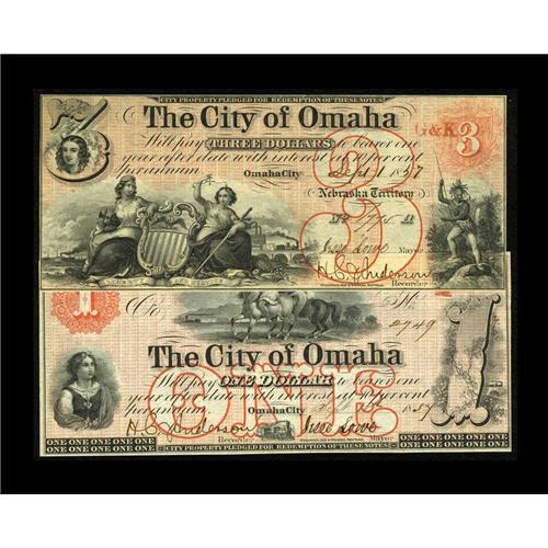 <B>Omaha, NE- City of Omaha</B></I> $1; $3 Sep. 1857<BR>These are remainders with the <B>Choice CU</B></I> $1 having bright paper and a pinhole, while the $3 is <B>CU.</B></I>