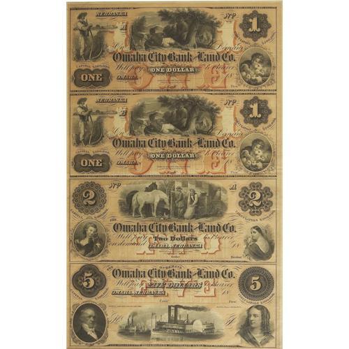 <B>Omaha, NE- Omaha City Bank and Land Co</B></I>. $1-$1-$2-$5 18__ G2a-G2a-G4a-G6a Uncut Sheet<BR> This striking sheet is professionally matted within a modern glass frame measuring approximately 16 by 37 inches. We are unable to grade this item due to it being under glass, but it appears to be at least <B>Choice CU</B></I>. This is only the second sheet we have handled on this short-lived enterprise and we have seen individual notes from here in the past fetch over $200. This item will look great either in the home or office. <I>There will be no returns on this lot for any reason. </B></I><BR><BR><b>Shipping:</b> Coins & Currency (<a target="_blank" href="http://www.heritageauctions.com/common/shipping.php">view shipping information</a>)