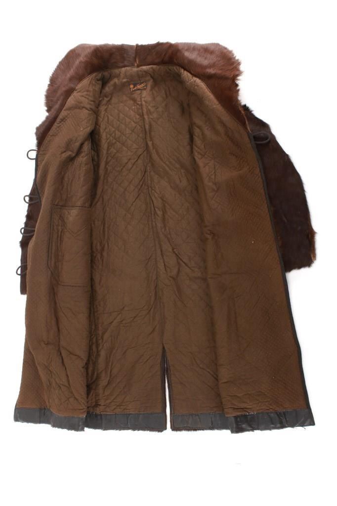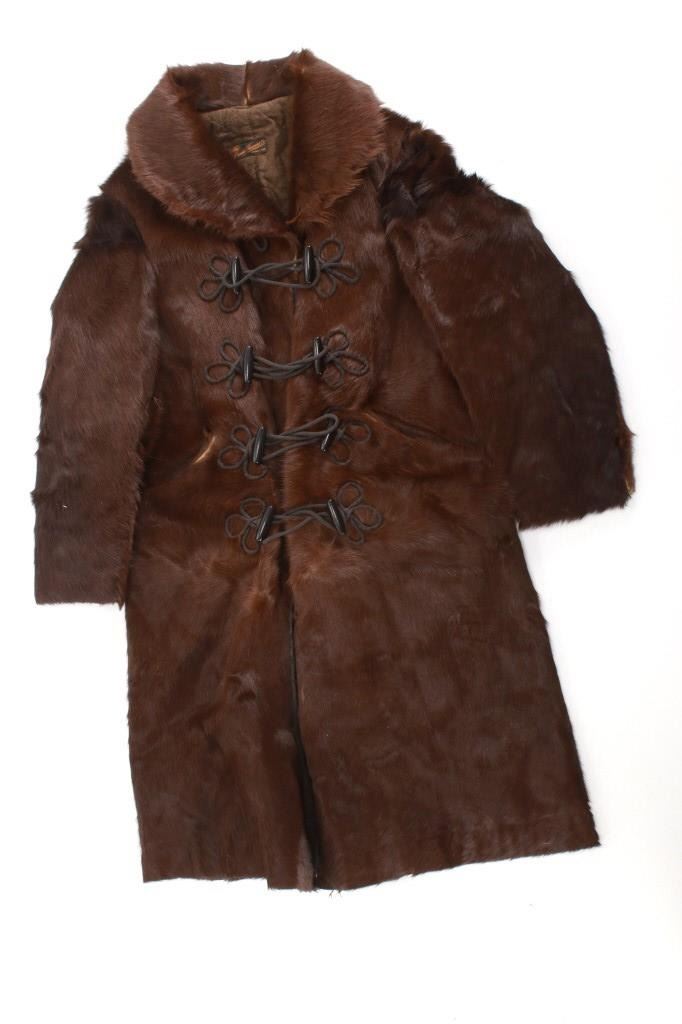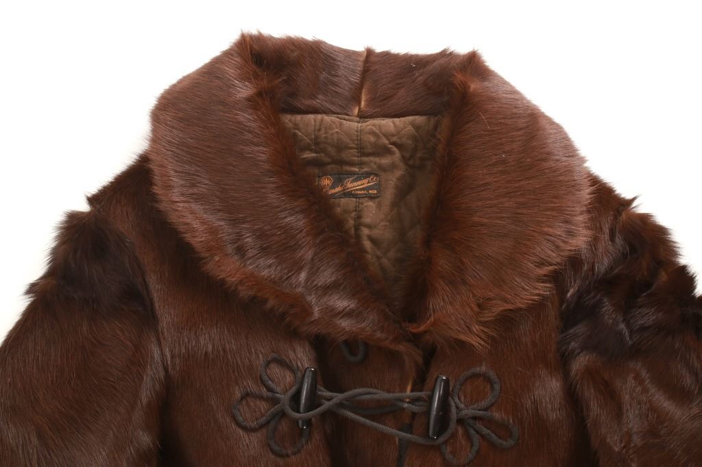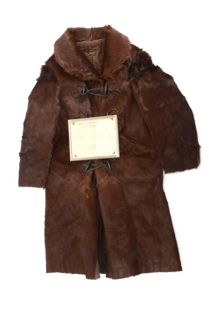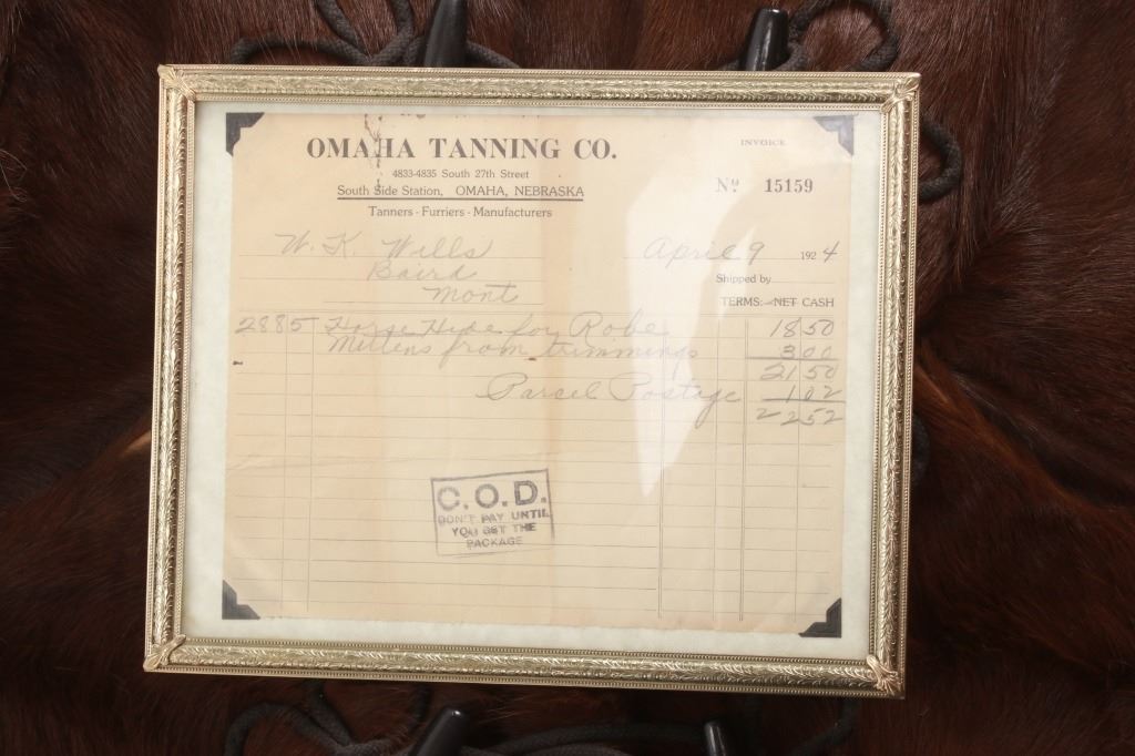 Featured in this lot is this Omaha Tanning Co. horse hide stagecoach jacket circa 1924. The jacket shows a wonderfully and professionally crafted horse hide construction with a beautiful design with a unique system of buttons down the front ands a very soft horse hide fur. The stagecoach coat comes with a provenance receipt from Omaha Tanning Co. out of Omaha, Nebraska No. 15159 on April 9, 1924 and sold to a N.K. Hills out of Baird, Montana. The condition of this coat is good with no obvious signs of damage and in good overall condition. The measurements of this coat are 49" x 24".