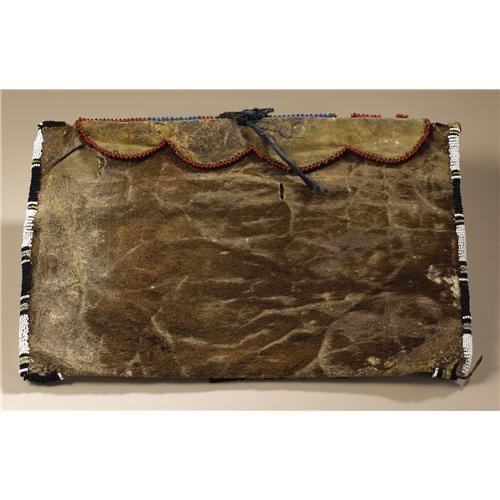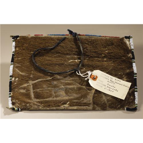 <B>Omaha Woman's Sewing Bag</B></I><BR>Circa 1865<BR>Length 8 in. Width 11 3/4 in.<BR><BR>This rectangular shaped bag is made of native tanned buffalo hide with the hair attached. Bags of this type were commonly used by women to store their sewing tools and materials. This example is beaded along each side with seed beads and across the scalloped cover flap in pony beads. It is a fine example from the pre-reservation era. (For similar examples see: Hanson, James A., <I>Little Chief's Gatherings,</B></I> The Fur Press, Crawford, Nebraska, 1996, pp. 68 and 69; and in Thompson, Judy; <I>The North American Indian Collection: A Catalogue,</B></I> Berne Historical Museum, Switzerland, 1977, p. 160.)<BR><BR>Provenance<BR>Collected by Milford Chandler before 1926. Chandler-Pohrt Collection #3152.<BR><BR> <BR><BR><B>Important not