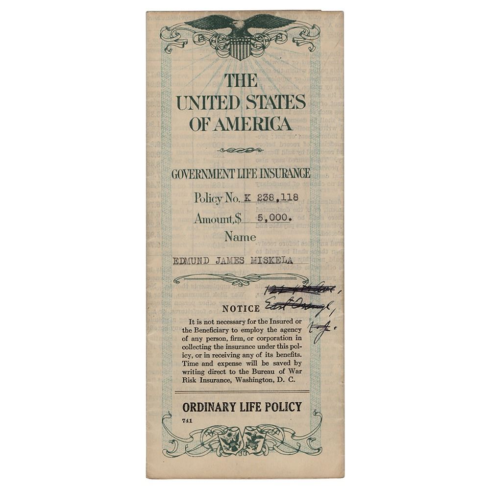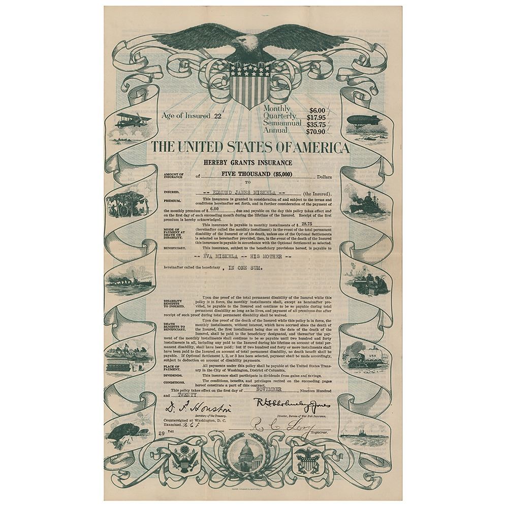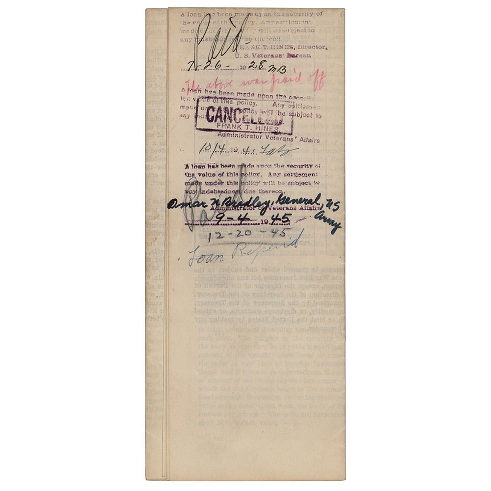 DS, signed “Omar N. Bradley, General, US Army,†three pages, 9.5 x 15.5, November 1, 1920. An ordinary government life insurance policy issued to Edmund James Miskela for the amount of $5,000. Signed on the reverse in black ink by Bradley as the Administrator of Veterans Affairs, dating his approval signature on September 4, 1945. In fine condition.