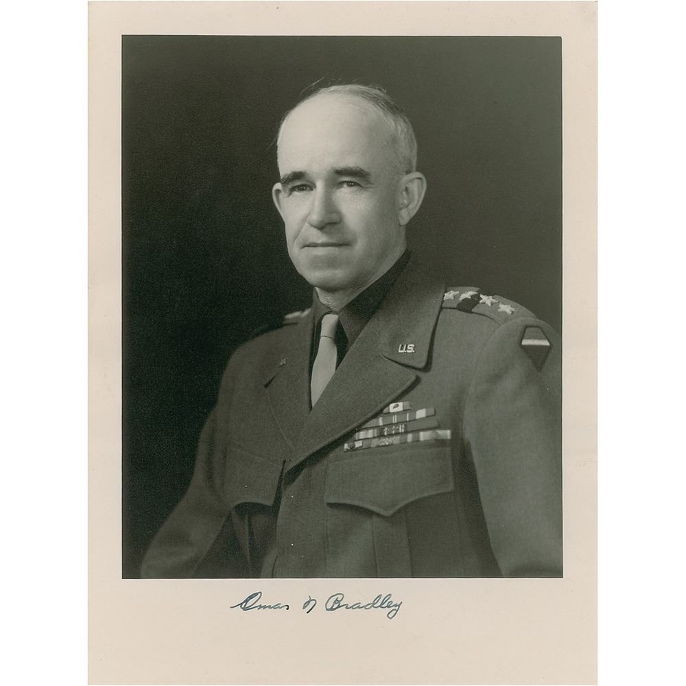 Vintage matte-finish 7 x 9.25 half-length photo of General Bradley in his four-star uniform, signed in the lower border in fountain pen, "Omar N. Bradley." Collector's notation to reverse dates the autograph to February 8, 1946. In very good to fine condition, with overall light rippling.