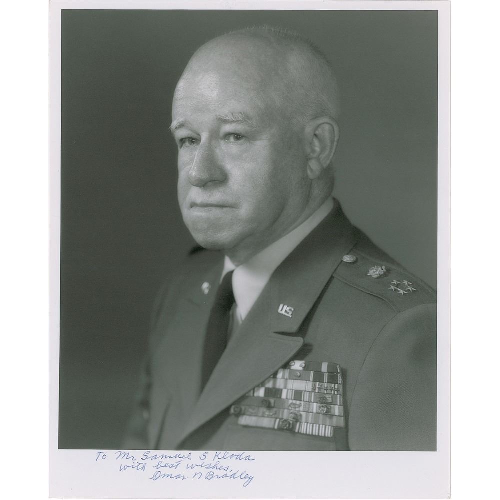 Official matte-finish 8 x 10 photo of Bradley in uniform, signed and inscribed in blue ballpoint, "To Mr. Samuel S. Kloda, with best wishes, Omar N. Bradley.” Reverse bears US Army caption text. In very fine condition.
