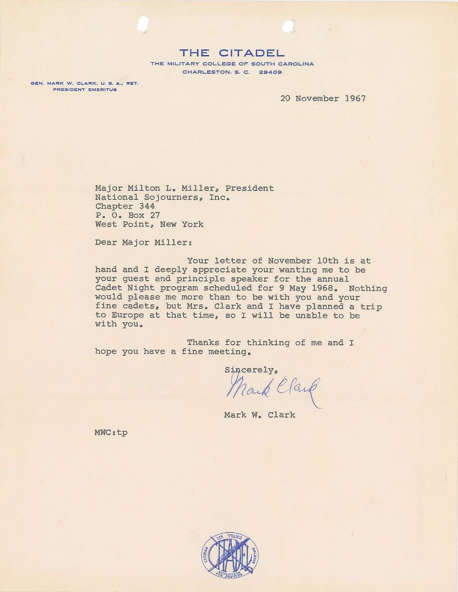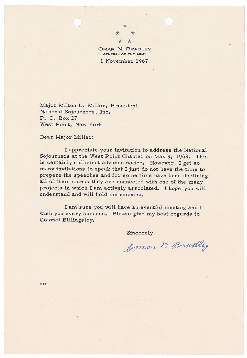 Two TLSs, signed “Omar N. Bradley” and “Mark Clark,” both one page, addressed to Major Milton Miller and declining invitations to address the National Sojourners at the West Point Chapter on May 9, 1968. The Bradley letter, dated November 1, 1967, in part: “This is certainly sufficient advance notice. However, I get so many invitations to speak that I just do not have the time to prepare the speeches and for some time have been declining all of them unless they are connected with one of the many projects in which I am actively associated”; the Clark letter, dated November 20, 1967, in part: “Nothing would please me more than to be with you and your fine cadets, but Mrs. Clark and I have planned a trip to Europe at that time, so I will be unable to be with you.” In overall fine condition, with two punch holes to the top of each letter.