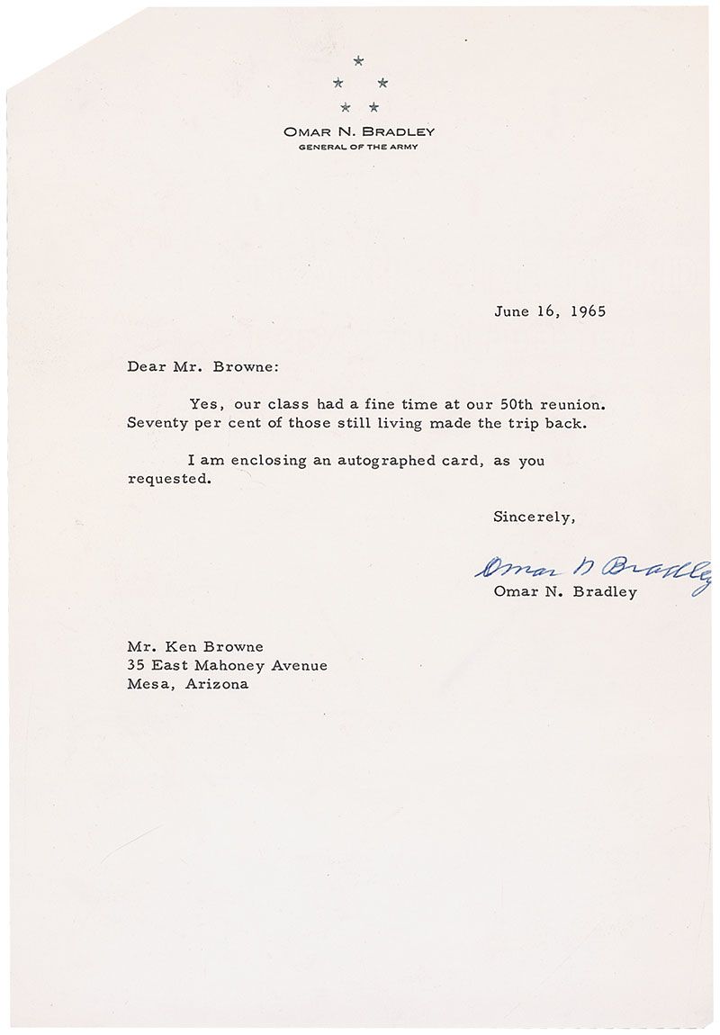 TLS signed “Omar N. Bradley,” one page, 7.25 x 10.5, personal letterhead, June 16, 1965. Short letter to a collector. In part; “Yes, our class had a fine time at our 50th reunion. Seventy percent of those still living made the trip back.” Signature a bit cramped along right edge, a few creases, and a trimmed top left corner, otherwise fine condition.