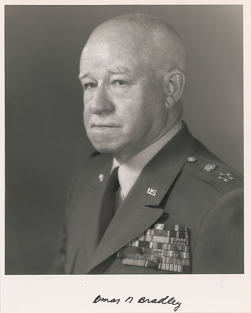 Matte-finish 8 x 10 photo of Bradley in full uniform, signed in the lower border in black felt tip, “Omar N. Bradley.” In fine condition.