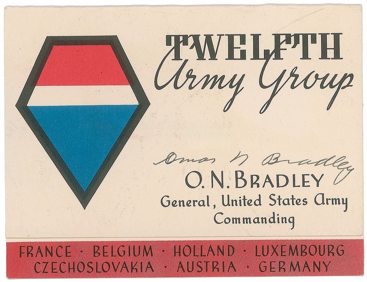 Colorful patriotic folding card commemorating the service of the Twelfth Army Group in defeating the Germans during World War II, measuring 5 x 3.75 closed, signed on the front in fountain pen, “Omar N. Bradley.” The card opens to 5 x 7 and features a map of their route through Europe. In fine condition.