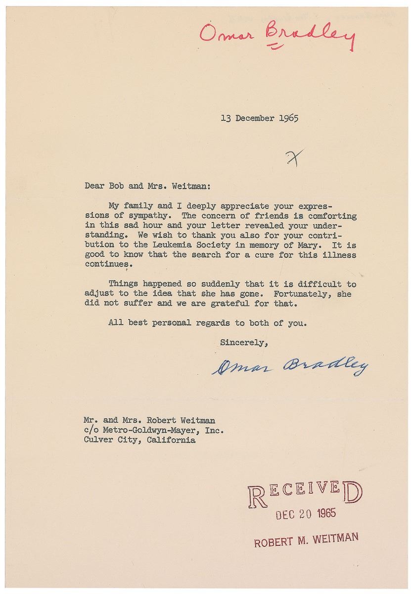 TLS, one page, 7 x 10, December 13, 1965. Letter to MGM executive Robert Weitman. In part: “I deeply appreciate your expressions of sympathy. The concern of friends is comforting in this sad hour and your letter revealed your understanding. We wish to thank you also for your contribution to the Leukemia Society in memory of Mary. It is good to know that the search for a cure for this illness continues.” In fine condition, with various office stamps and notations.