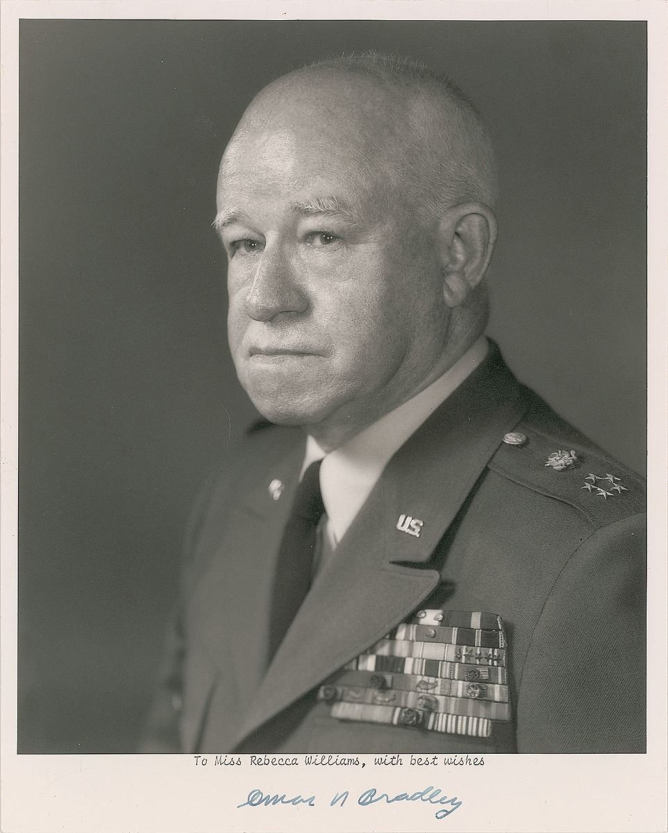 Matte-finish 8 x 10 photo of Bradley in uniform, signed in the lower border in fountain pen, “Omar N. Bradley,” with a typed inscription above. A 1971 transmittal letter from his office is affixed to the reverse. In fine condition.