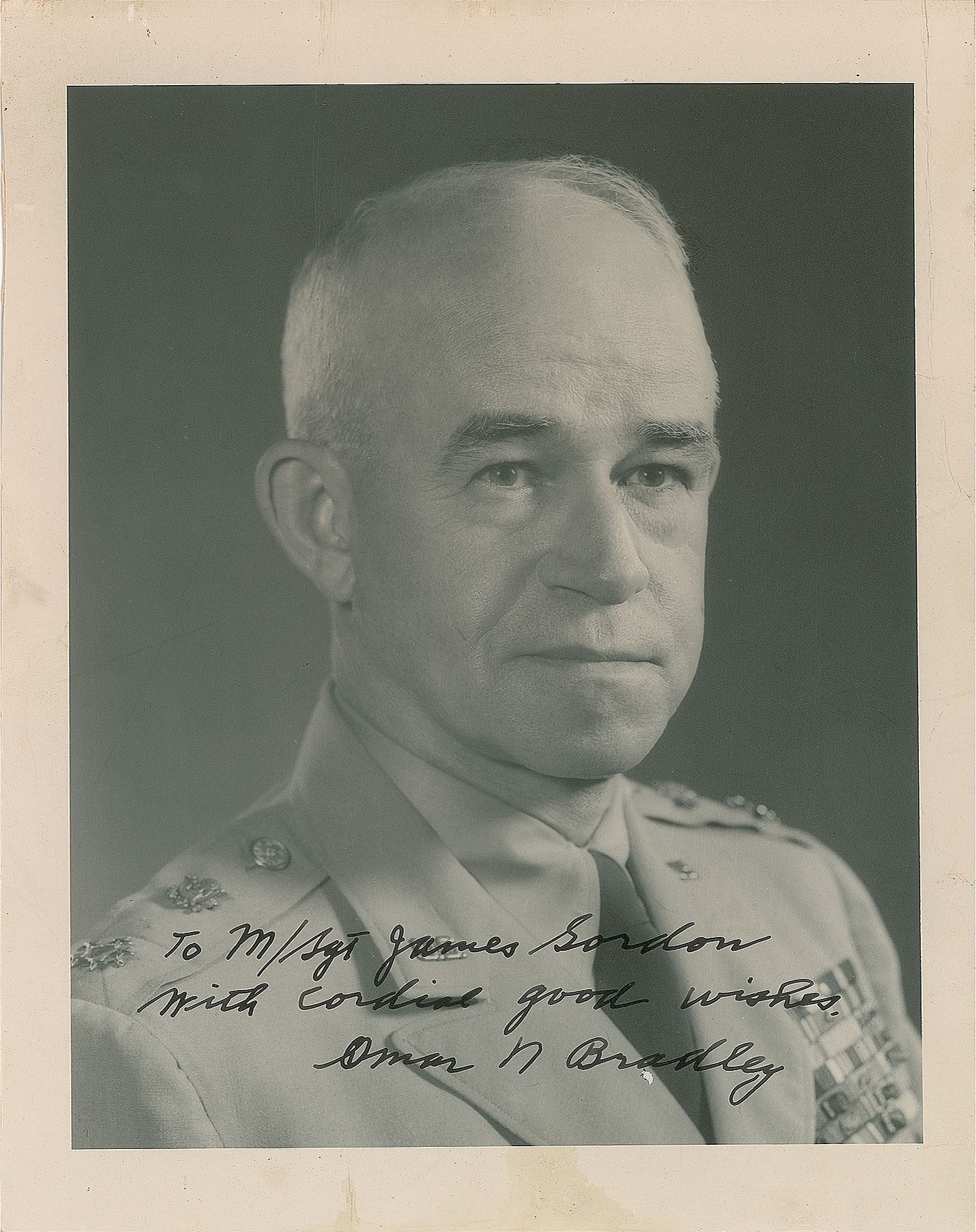Matte-finish 8.5 x 11 photo of the decorated general, boldly signed and inscribed in fountain pen, "To M/Sgt. James Gordon, with cordial good wishes, Omar N. Bradley.” In very good to fine condition, with trimmed edges, soiling in the bottom border, and some vertical creases, one of which touches the side of Bradley's head.