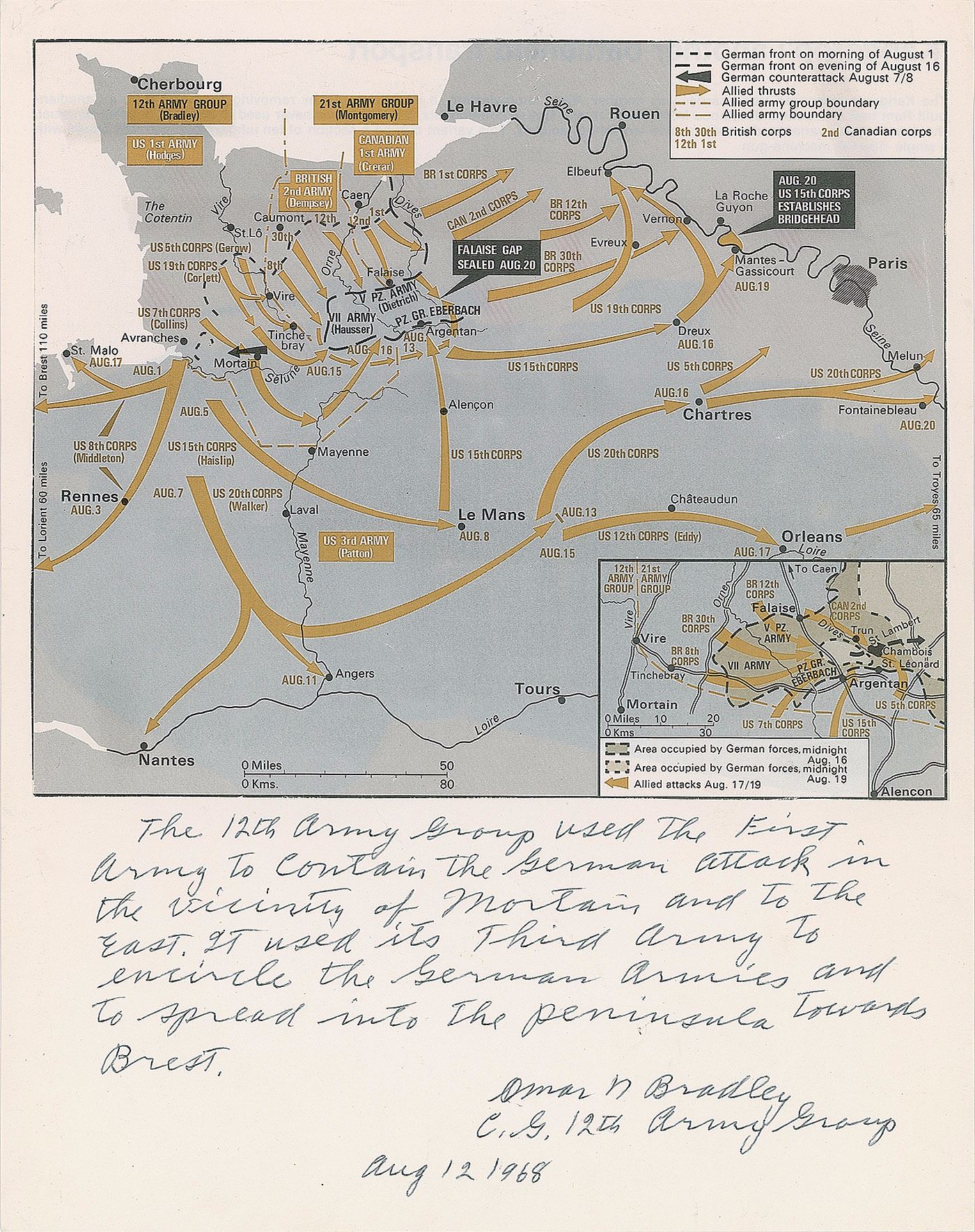 Map of France showing movements during the Battle of Normandy in August 1944, affixed to an 8.5 x 11 sheet, lengthily captioned below by Bradley in black ballpoint: "The 12th Army Group used the First Army to contain the German attack in the vicinity of Mortain and to the east. It used its Third Army to encircle the German Armies and to spread into the peninsula toward Brest. Omar N. Bradley, C. G. 12th Army Group, Aug. 12, 1968." In fine condition, with scattered light creasing.