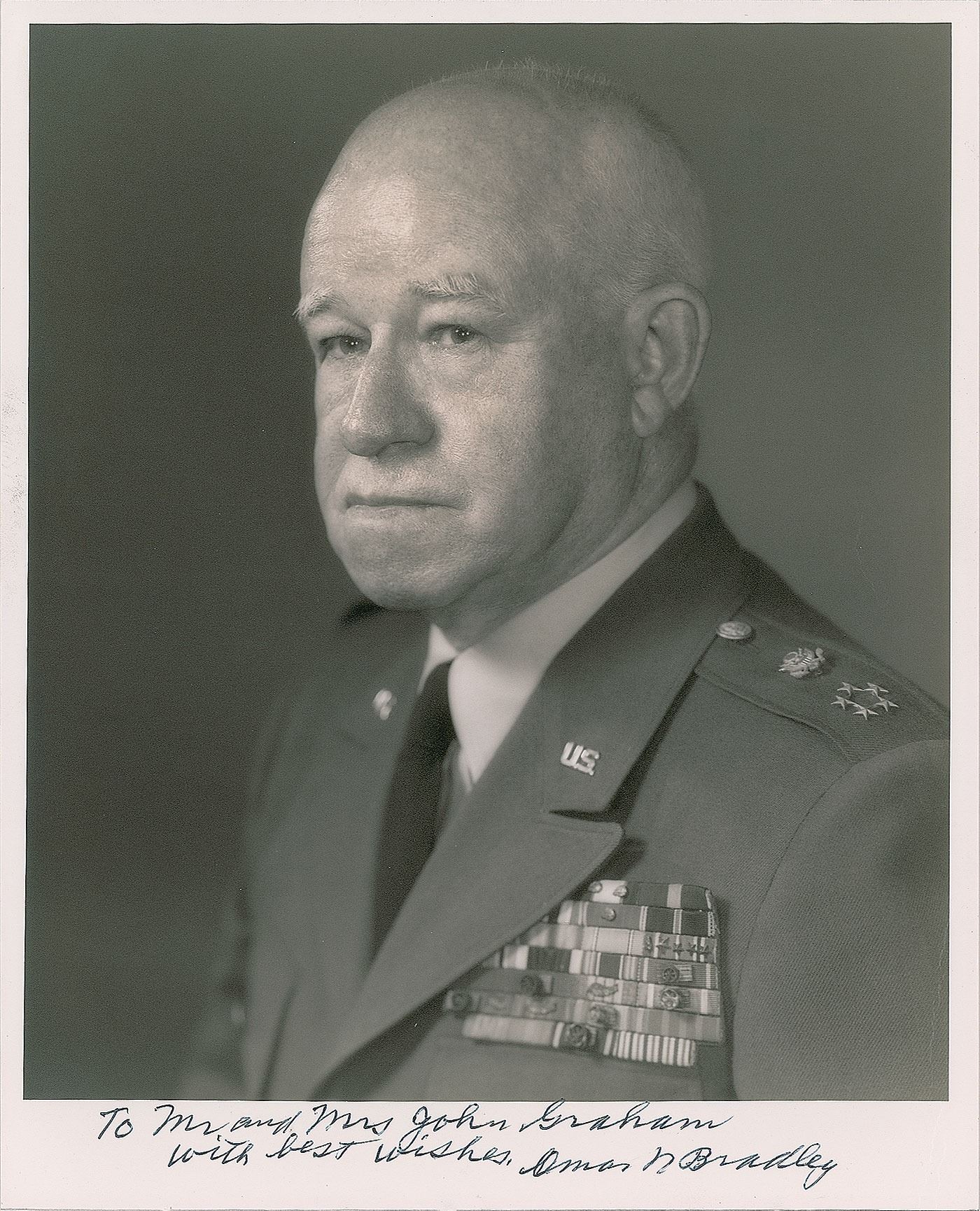 Matte-finish 8 x 10 bust-length portrait of Bradley wearing his five-star military uniform, signed and inscribed in the lower border in black ballpoint, "To Mr. and Mrs. John Graham, with best wishes, Omar N. Bradley.” Reverse bears a pair of US Army photography credit stamps. In fine condition, with some light surface impressions and light creasing to the right edge.