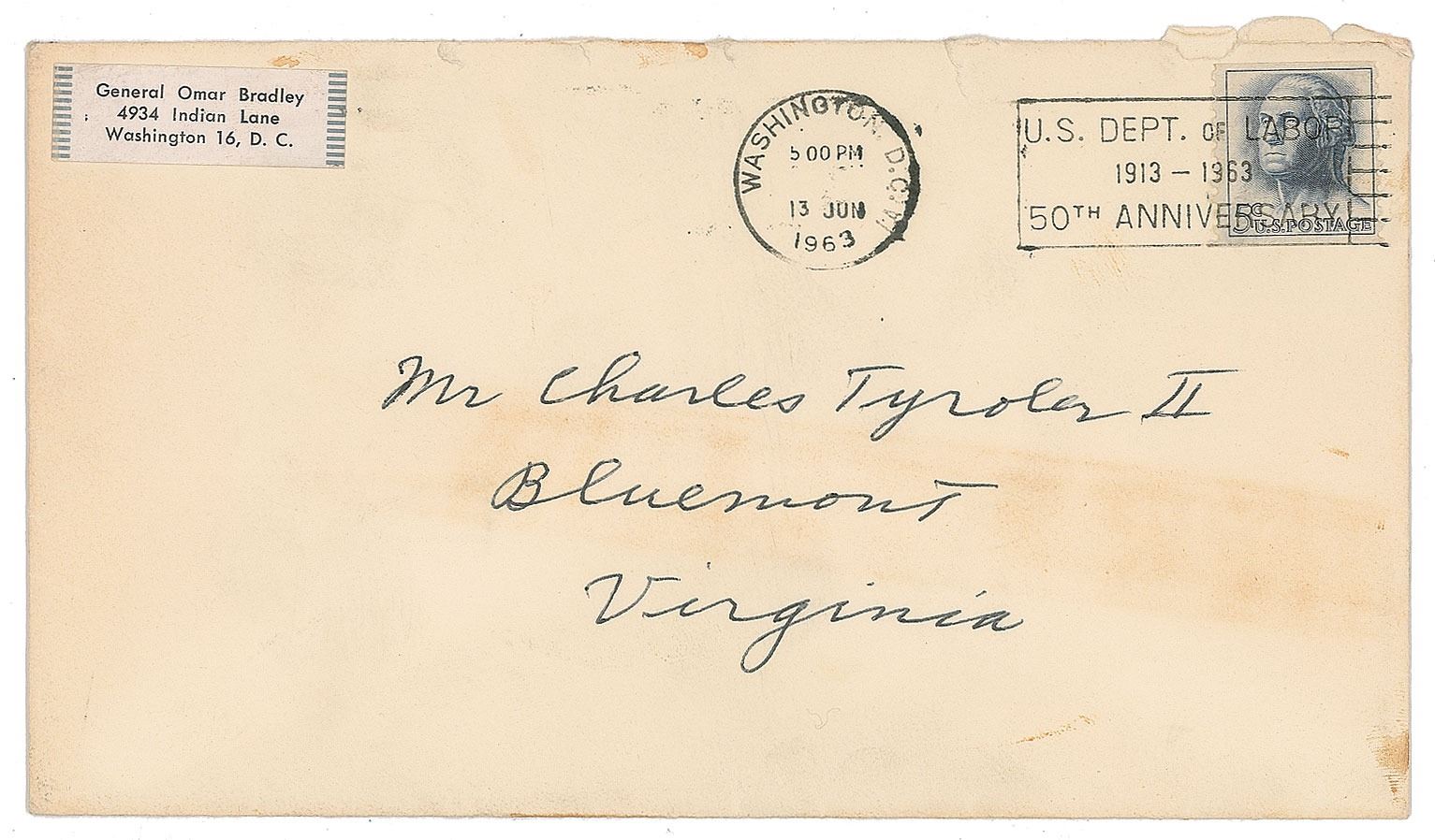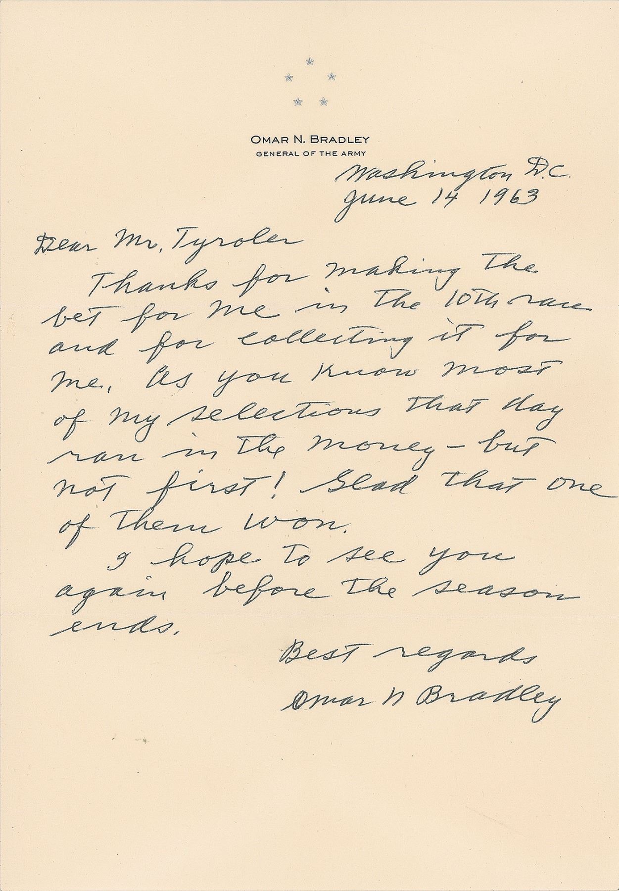 ALS signed “Omar N. Bradley,” one page, 7 x 10, personal five-star letterhead, June 14, 1963. Letter to longtime Democratic Party strategist Charles Tyroler II, in full: "Thanks for making the bet for me in the 10th race and for collecting it for me. As you know most of my selections that day ran in the money—but not first! Glad that one of them won. I hope to see you again before the season ends." In fine condition. Accompanied by the original mailing envelope addressed in Bradley's hand.