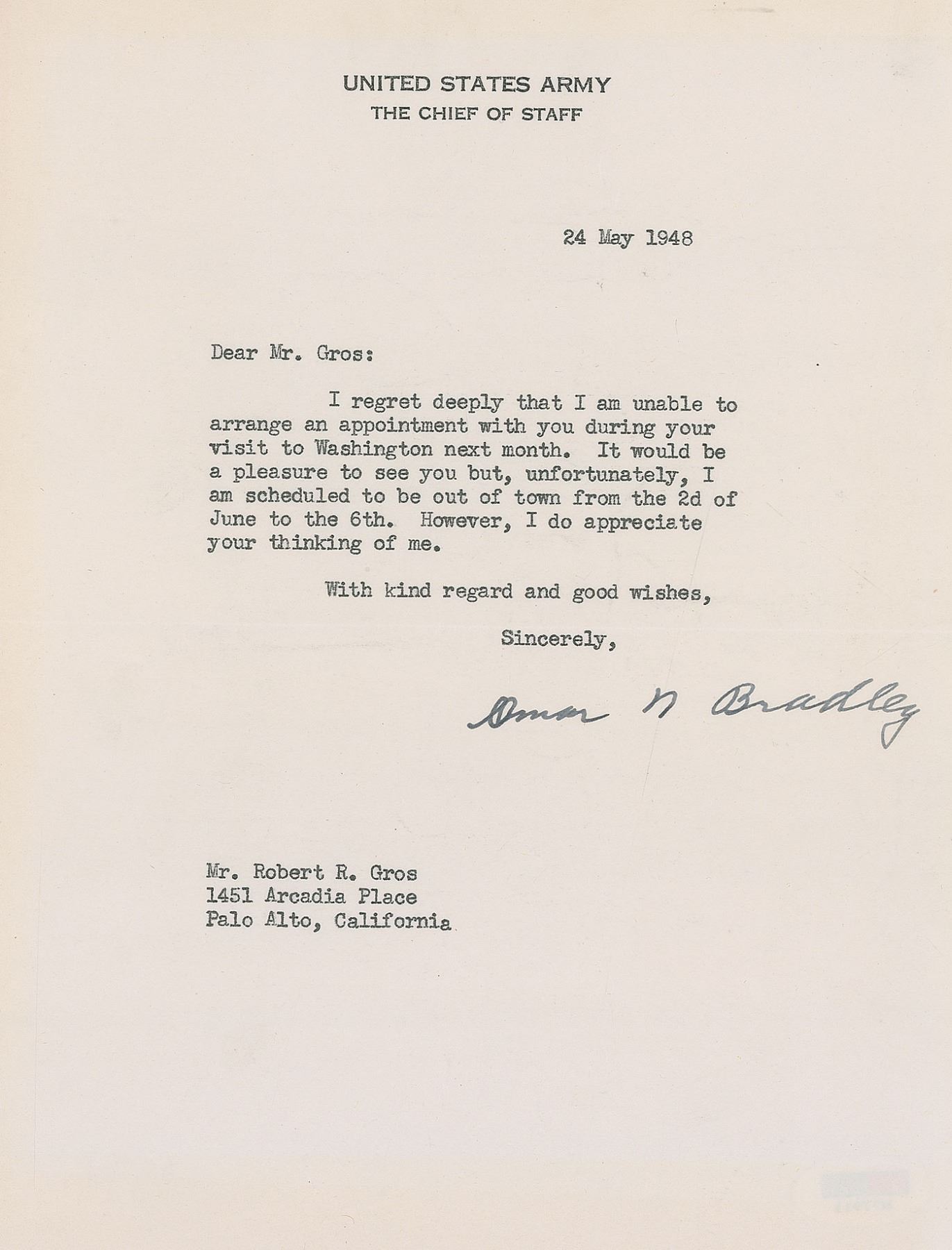 TLS signed "Omar N. Bradley," one page, 7 x 9, United States Army letterhead, May 24, 1948. Letter to Robert R. Gros. In part: "I regret deeply that I am unable to arrange an appointment with you during your visit to Washington next month…I am scheduled to be out of town from the 2d of June to the 6th." In fine condition, with a PSA/DNA label affixed to the reverse. Accompanied by a certificate of authenticity from PSA/DNA and an unsigned photo of Bradley. An interesting association as he mentions June 6, 1948, which was the fourth anniversary of D-Day.